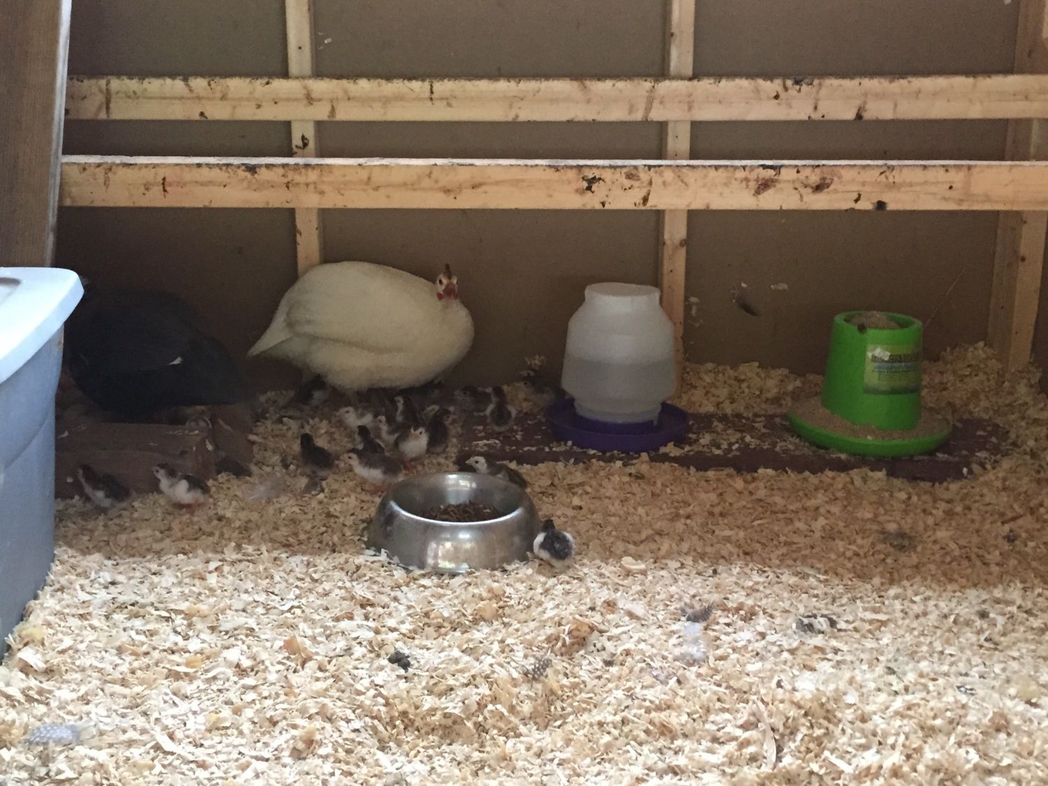 I thought I'd clean the shells and leave the few eggs that were left, the mamas still sit in the nest a lot so I guess we'll see what happens. I just had a horrible accident - the hatch opened and the mommas went oustside to the rest of the flock - all the keets in tow! I got them back inside and latched the door but one keet fell in a puddle of water that was on a tarp! I Hope he warms up fast. Keets were popping out of the wires of the coop and running loose in the driveway- I just pray I got them all. I looked a bunch of times for any strays UGH.