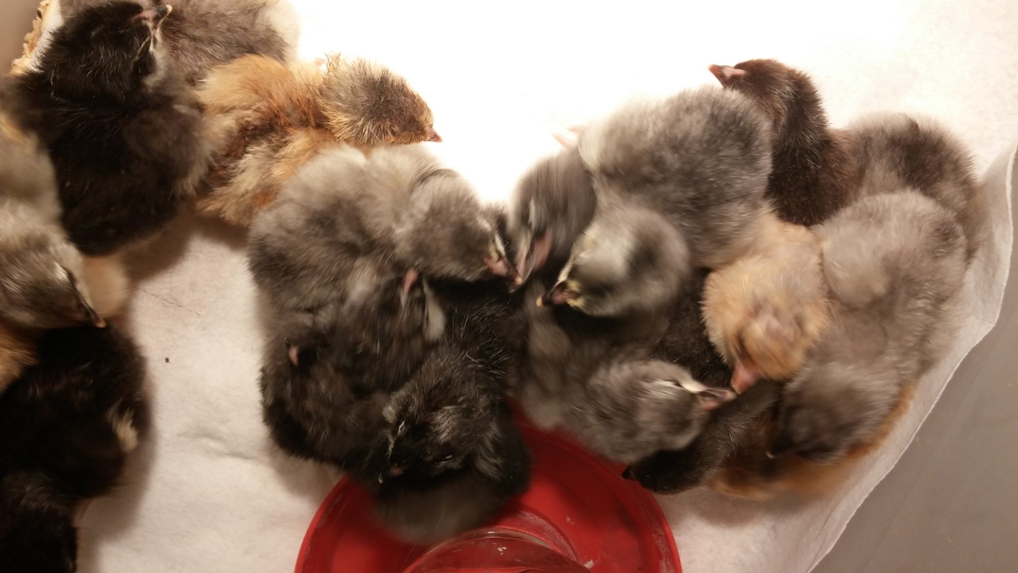Now promise you won't laugh.....just a thought. I have two bantam chicks inside with me. I do not have a brooder. I've come up with a small cat carrier,with a heating pad inside,a washcloth over it and a little bit of pine chips. They stay very warm and cozy. However,I noticed they were having a hard time falling asleep. I thought about it and I had an epiphany! Lol what would they normally be doing right now if they were to be going to sleep with their mama? Yes! Nestling up under her breast. Snuggled in her feathers. So ,here's the part where you promised not to laugh,I put a stuffed animal frog in their house. Yep. A green plushy dog toy. And omgosh did it make a world of difference. It's the cutest thing. Every time they go nauny,they both get right up under Brea,the mama frog.![]()