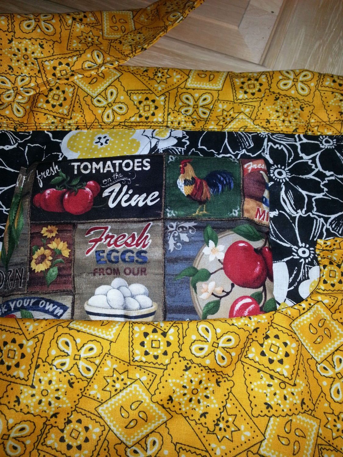 This apron is full of imperfections. I didn't really measure or iron or pin anything. It will probably hold up to daily use and washing. It has two quilted pockets that should each hold about 6 chicken eggs. The large center pocket can hold lots of other goodies. I'm not a professional seamstress, and I wouldn't exactly call it etsy quality. Is this good enough for a donation?