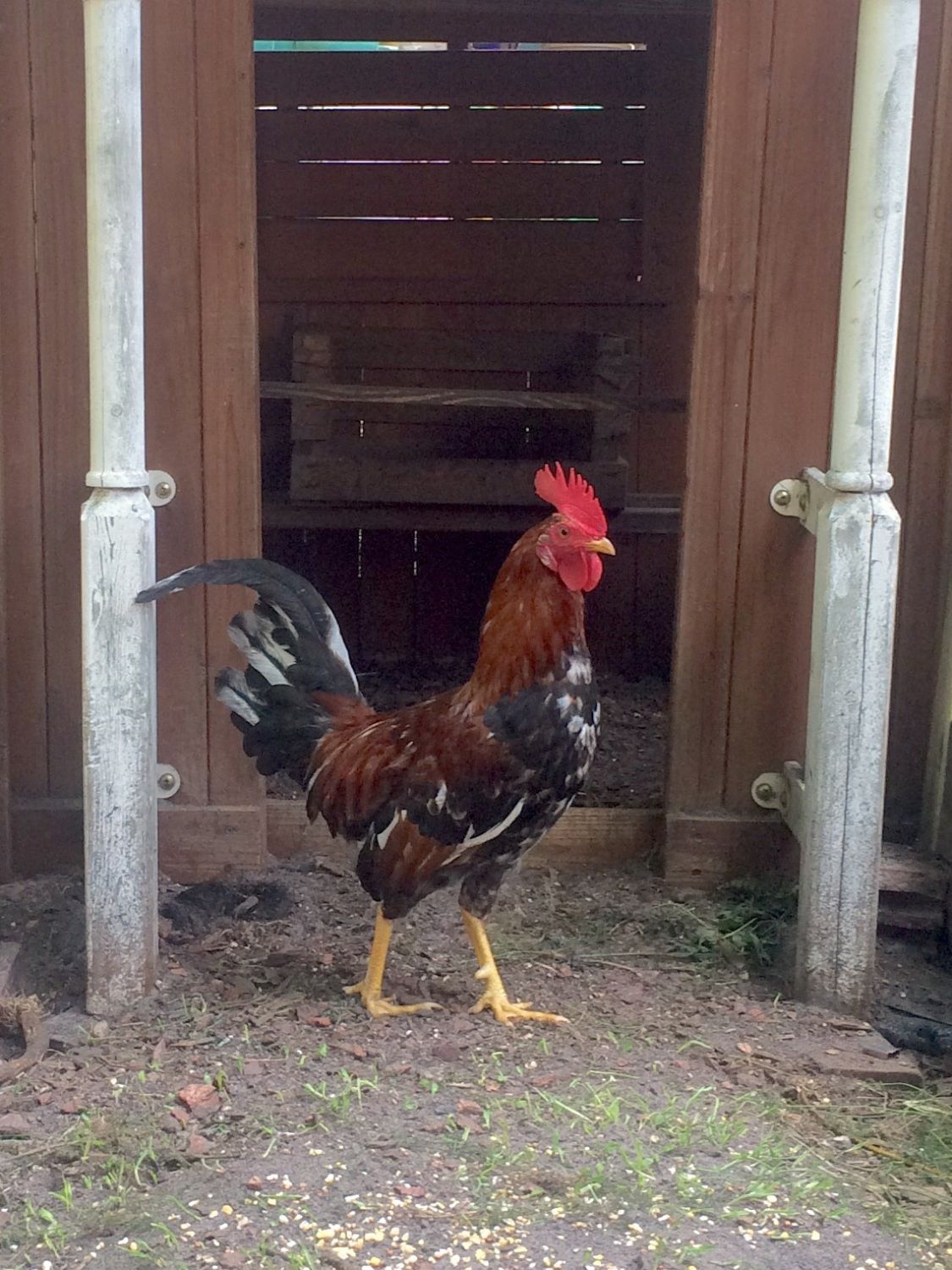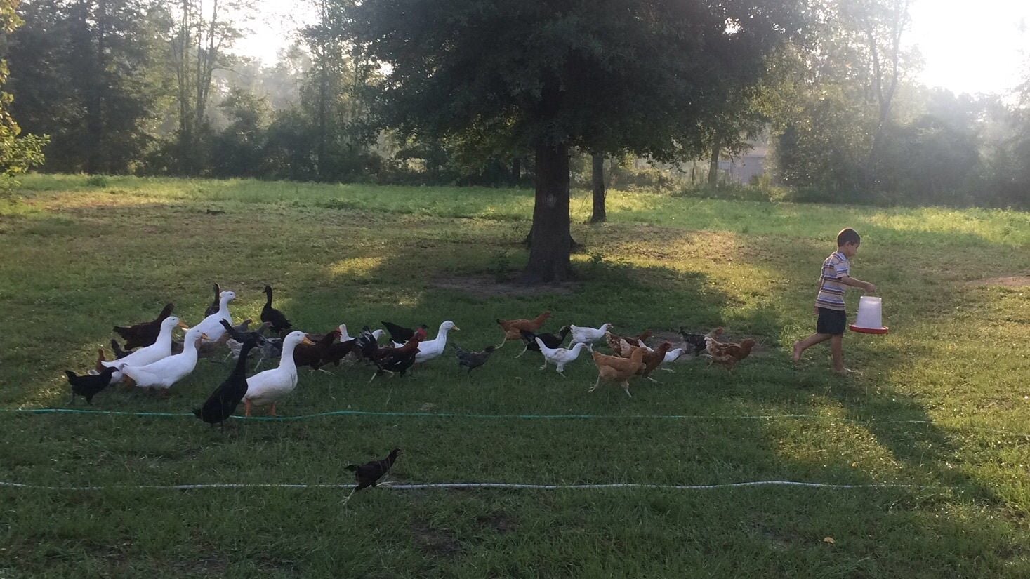 The whole flock chasing down their breakfast. (My 6-year-old wanted to help feed the chickens and ducks, but they surrounded him. So, he had make a run for the coop to get the feeder put back in place. LOL!)