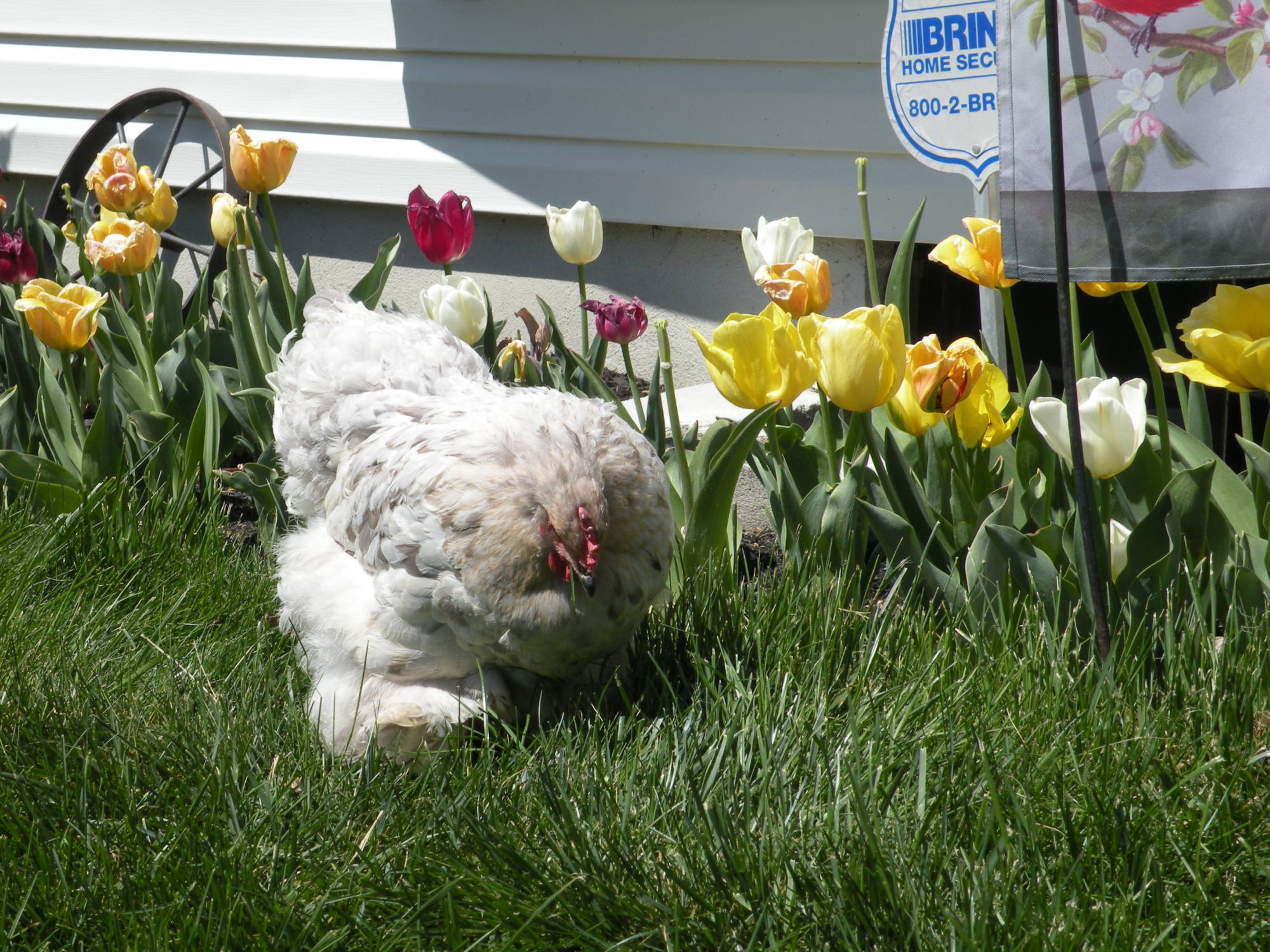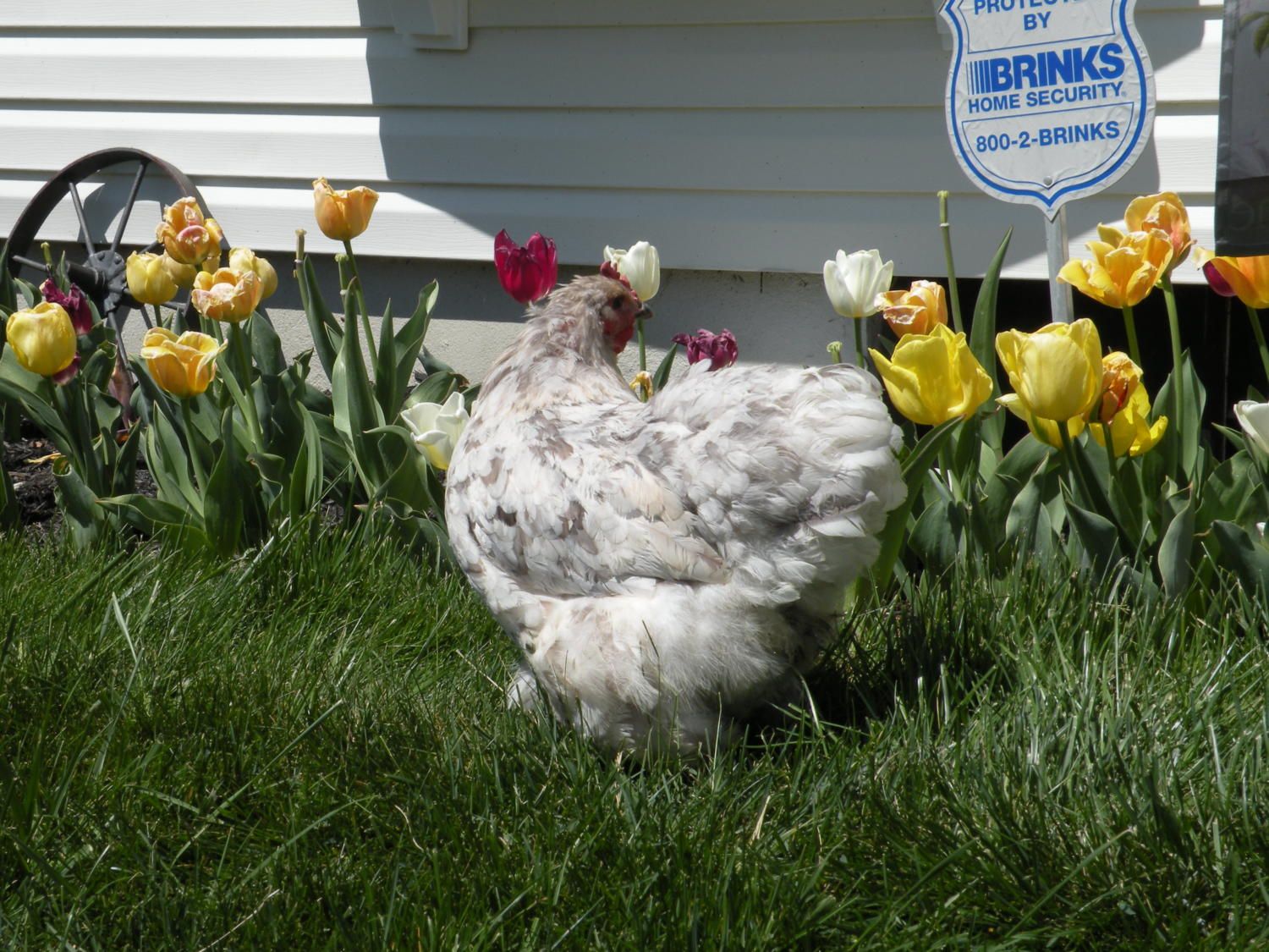 Second shot: Gilly, my beautiful Blue Cochin hen, took a moment to enjoy the tulips this past Spring.