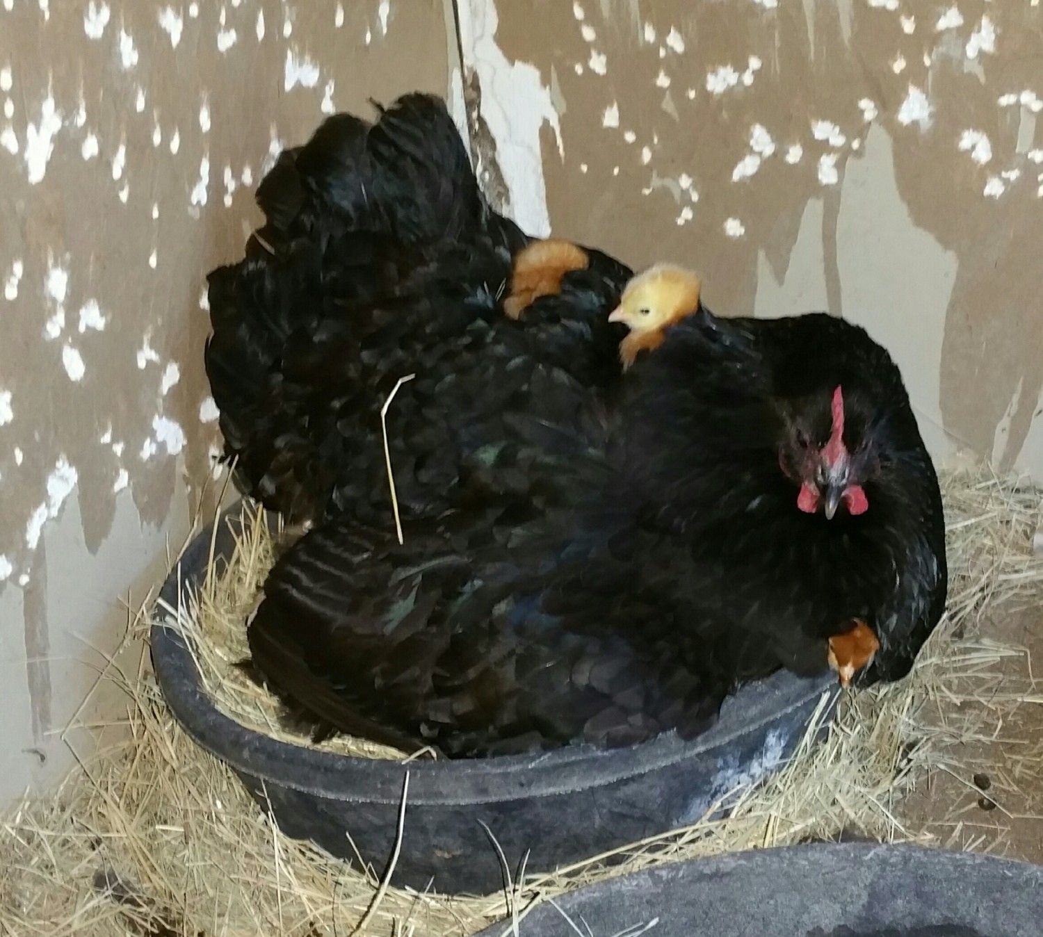 So far, the chicks have stayed right with her, and we moved her to her own little broody pad where she can concentrate on raising her large brood.