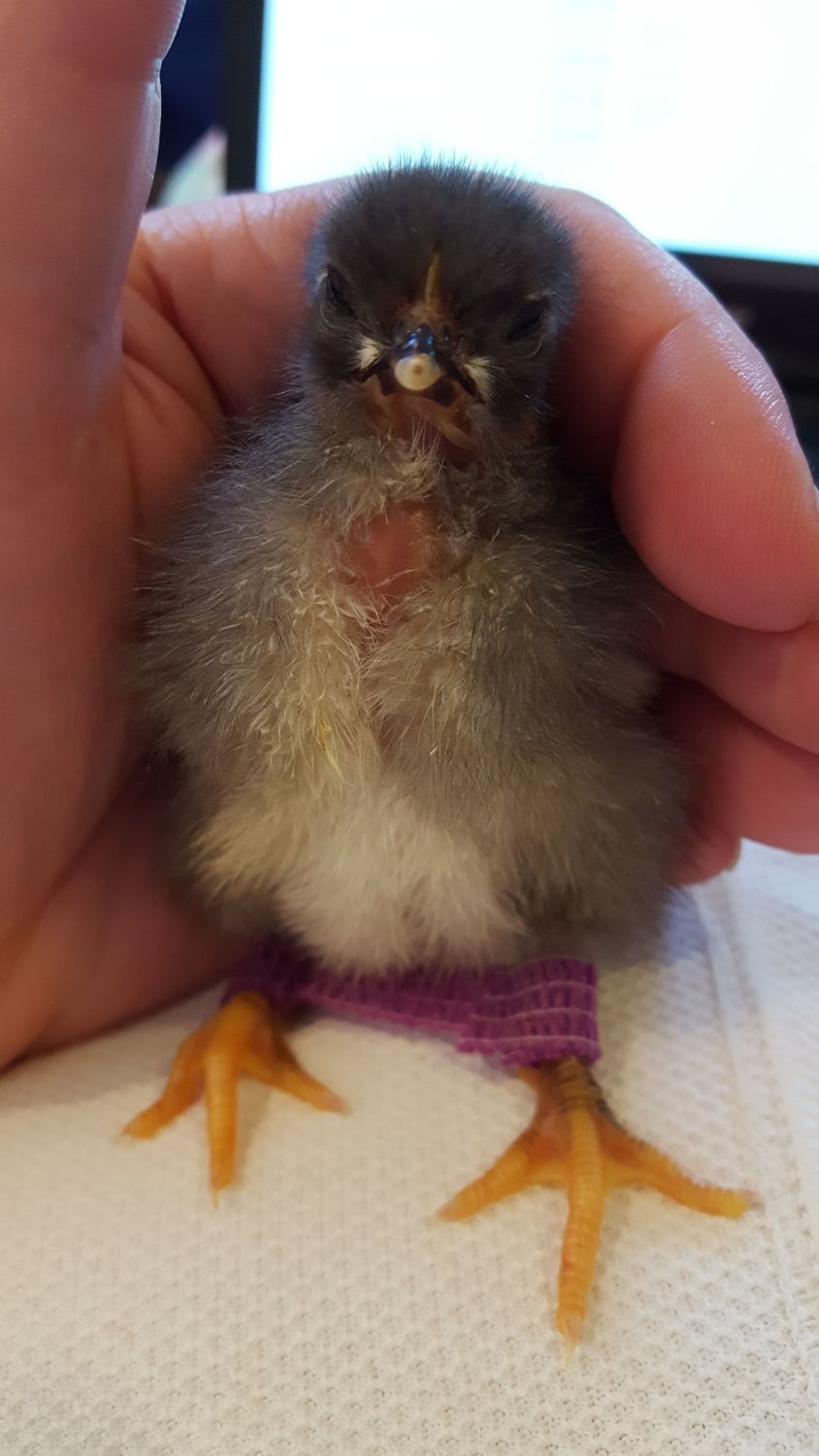 On Aug 2 1 chick of 2 hatched. The humidity was off in my incubator. It is a NN so it skin is very thin to begin with but I could see thru it. Its umbilical cord was still partially attached and its belly was very swollen. Then I noticed the splayed leg. This poor chick was all alone and chirping all the time. I made a brace for the legs and its getting around better. Tho still not stable due to the swollen belly. I thought the chirping was due to being along so I bought a 3 day old chick today to keep it company. No change is the chirping.