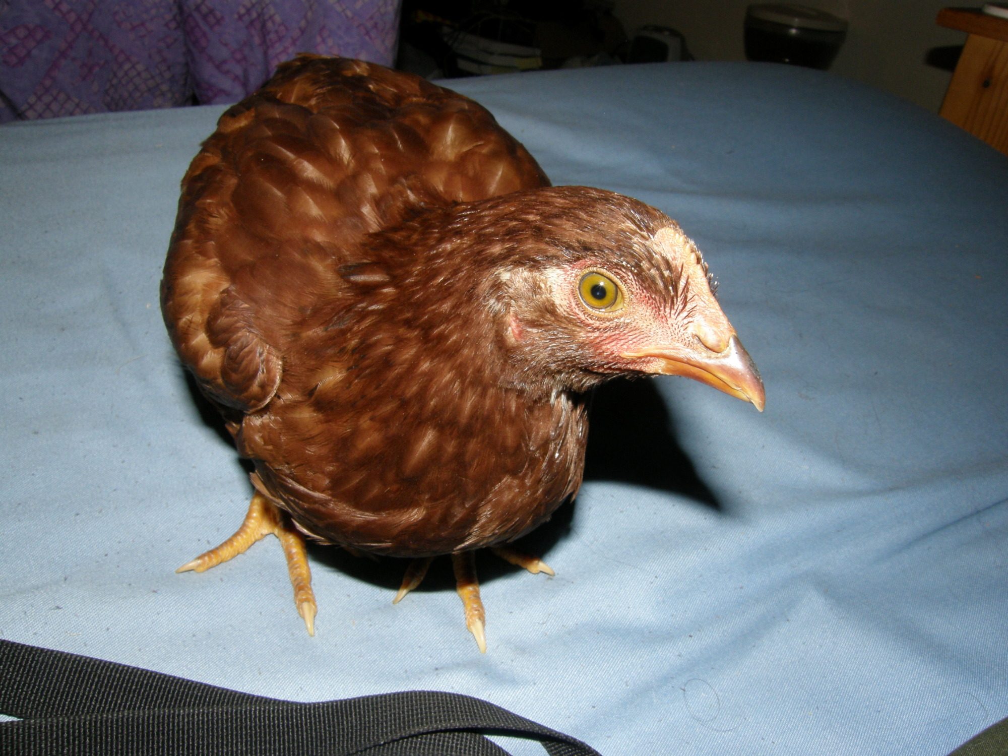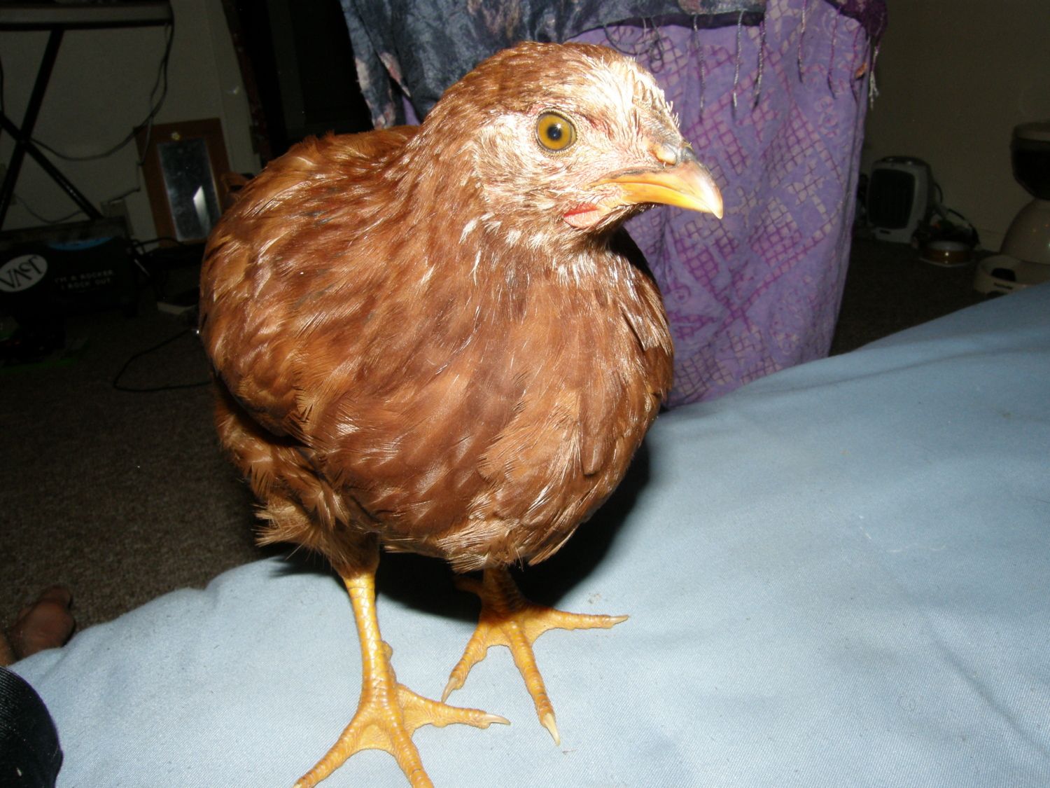 A close up of Suspected Rooster. A note on its title; one of the hawk victims was another RIR we referred to as Suspected Hen. Both were nearly identical when they were chicks but they started diverging strongly. Suspected Hen was clearly a lighter color, and lighter. (shortly before it was taken I weighed in Suspected Rooster at 1.5 lbs, while Suspected Hen was 1.0 lbs)