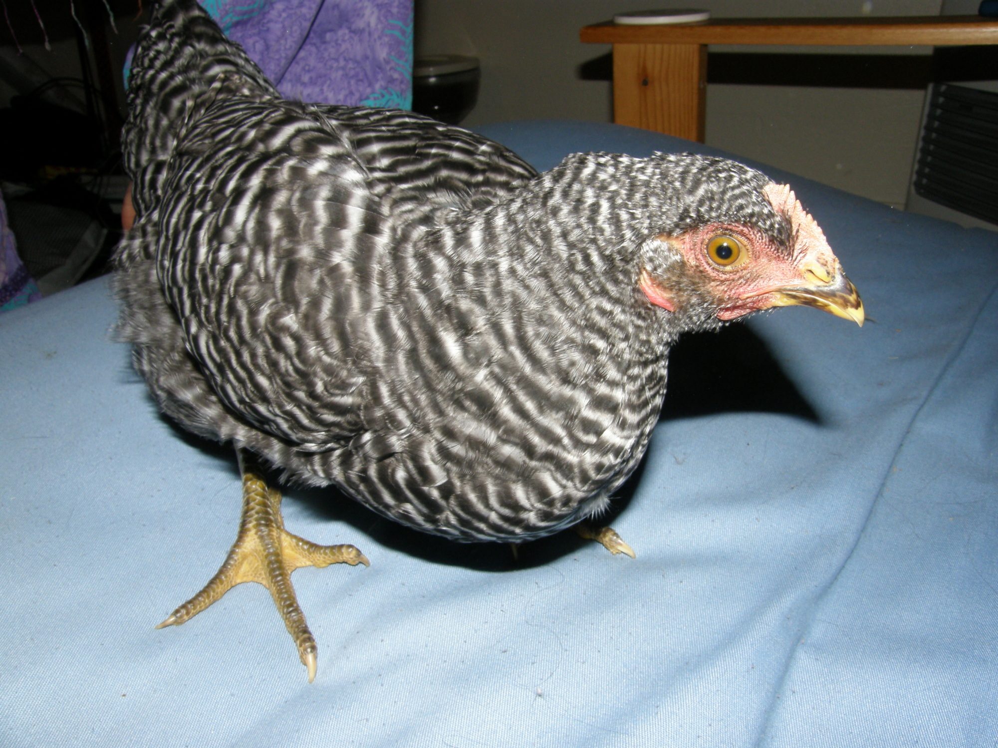 Closeup of The Whiner, a Plymouth Barred Rock.