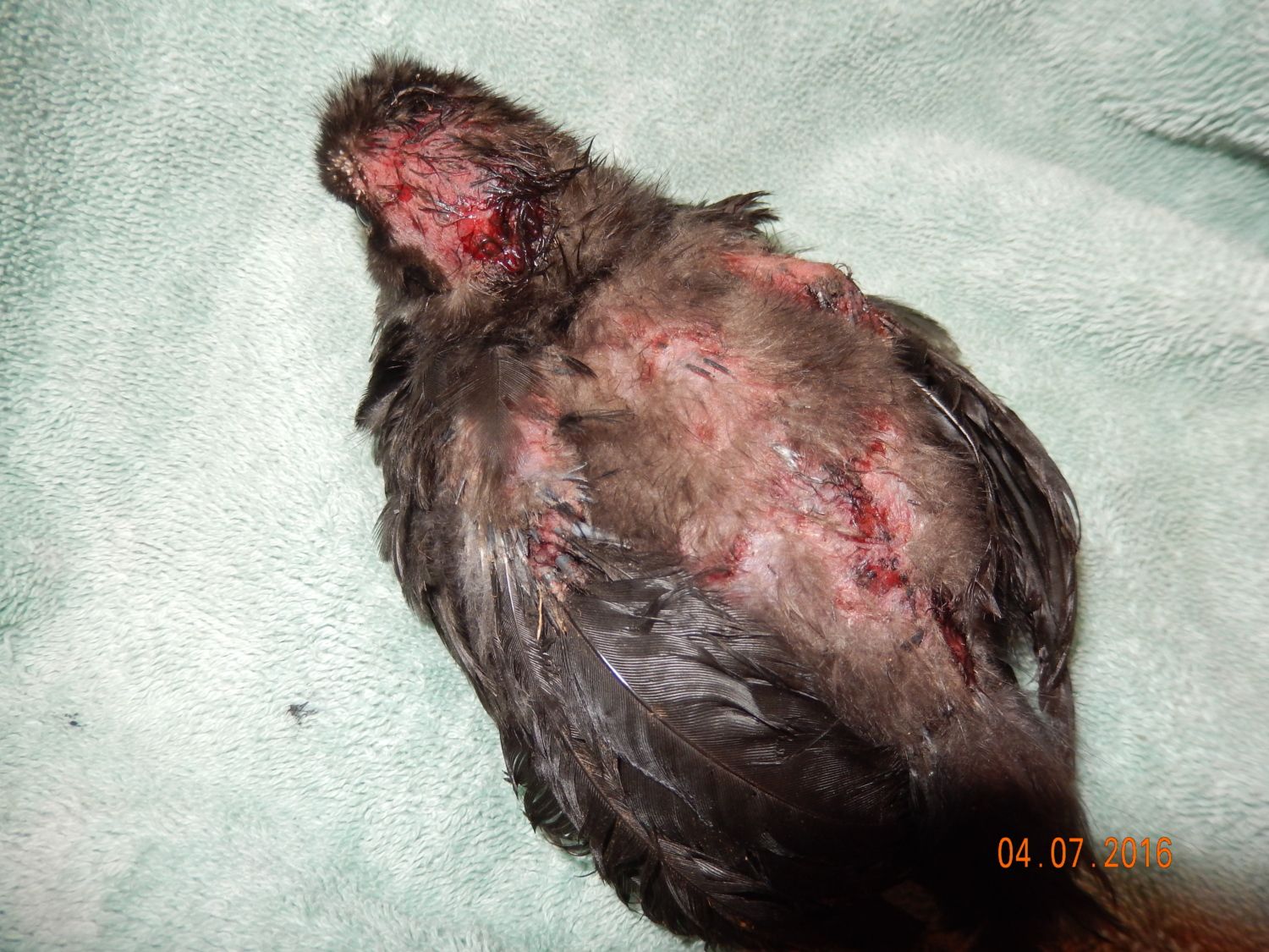 Thanks for your reply. Had to go to my daughters dress fitting for her wedding so I didnt get right back to you. I have blu-kote and neosporin. Should I use the neo. first and then blu-kote? I dont know how to tell if she is in shock. Any tips there?I'm sorry about your chick. Is she is shock? I would delay cleaning them if she is in rough shape, but Vetericyn wound spray, chlorhexidene, and weak betadine are very good to apply to the wound. Plain antibiotic ointment such as bacitracin or neosporin is good to apply, or you can use BluKote spray or dab on. If she is stocky, keep her quiet, and try to get her to take fluids with electrolytes and vitamins when she is better. Food, chopped egg, or watery food and yogurt can be offered when she is drinking well. Is her broody still taking care of the other chicks? BluKote can hide her wounds so she can get back out with the others quicker. I hope she makes it. Let us know how she is doing.