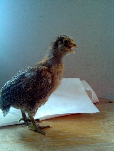 Another one of the EE. As you can see she really, really doesn't like being out of the brooder. She just called and called to her "sisters" until I put her back. She has such gorgeous plummage though.