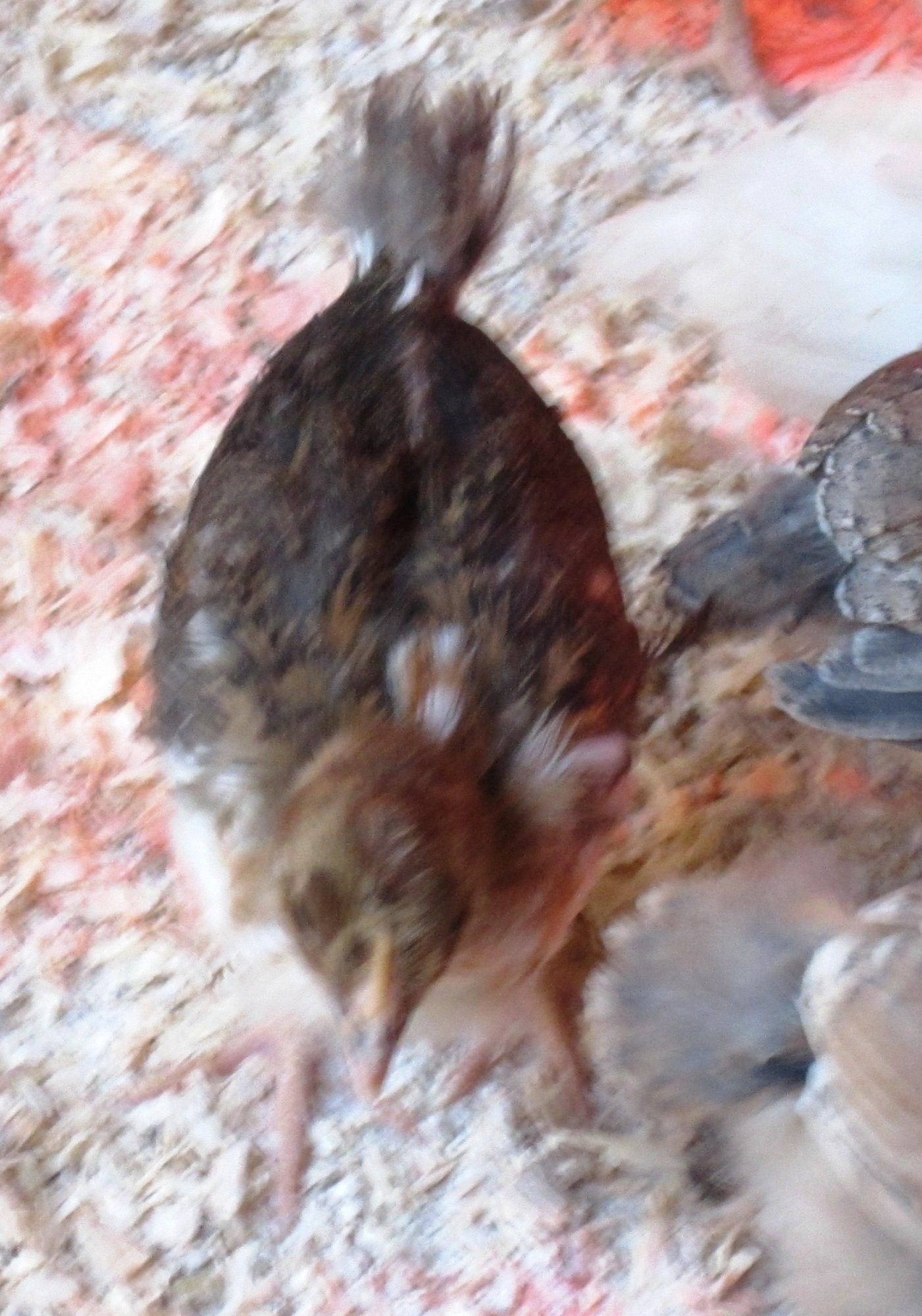 The blue and white one on the left is named "29"... as it was the last chick out...saved by my little girl because I was about to toss the egg and she said she heard a peep in the egg. I pipped it and it was out not long after that. It's mama is a big FBCM and the daddy was Fred, the Splash Wheaten roo. Should be a pretty Olive Egger but it's looking rooish to me.