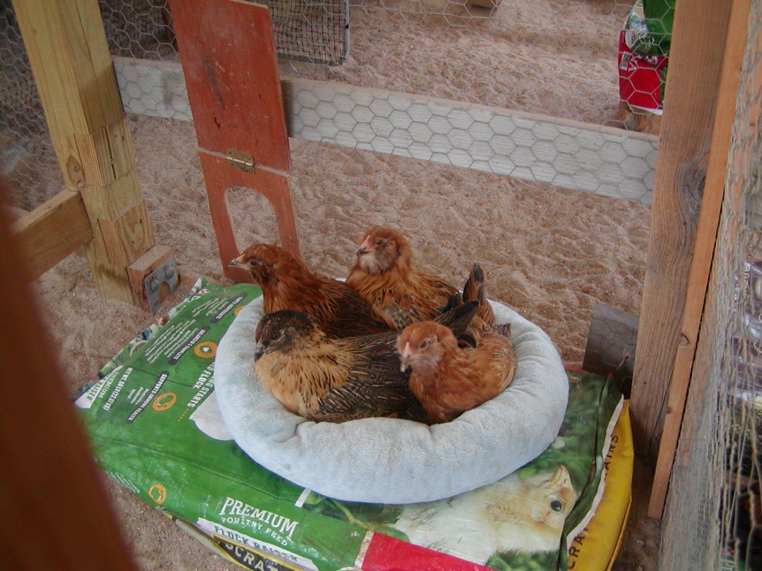MHP transitions them to sleeping in the coop, and after they've become accustomed to the coop as home and have learned how to go in at night from their run, I then teach them how to roost. Usually by six weeks they've got that wired.