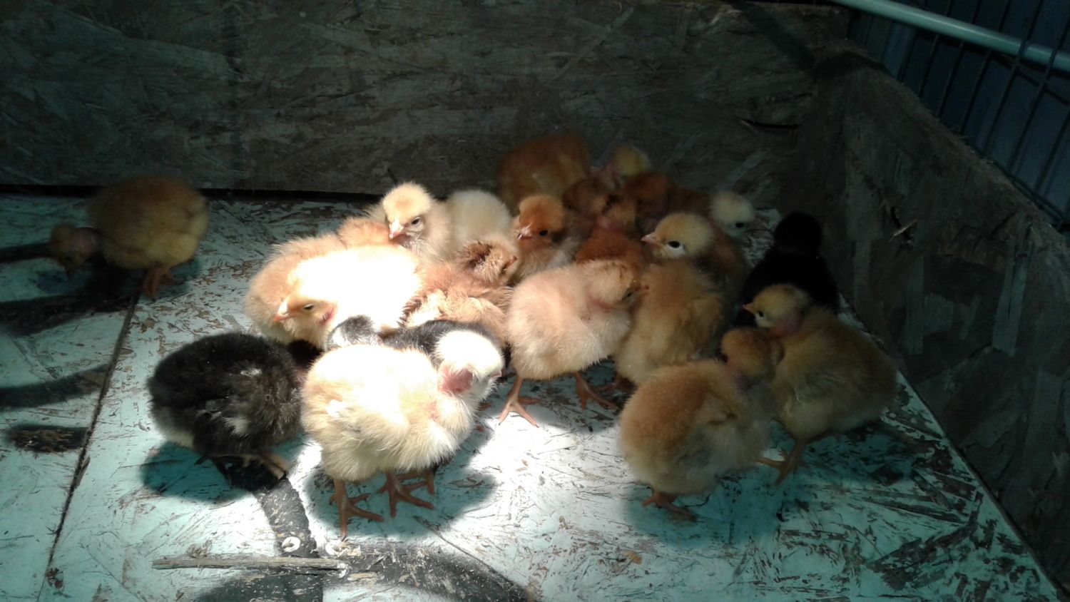 My mom sent me some pictures since i am still at school, so here are the Chicks! 20 leghorns, 2 Golden Polish, and 20 naked Necks. Plus one free bird