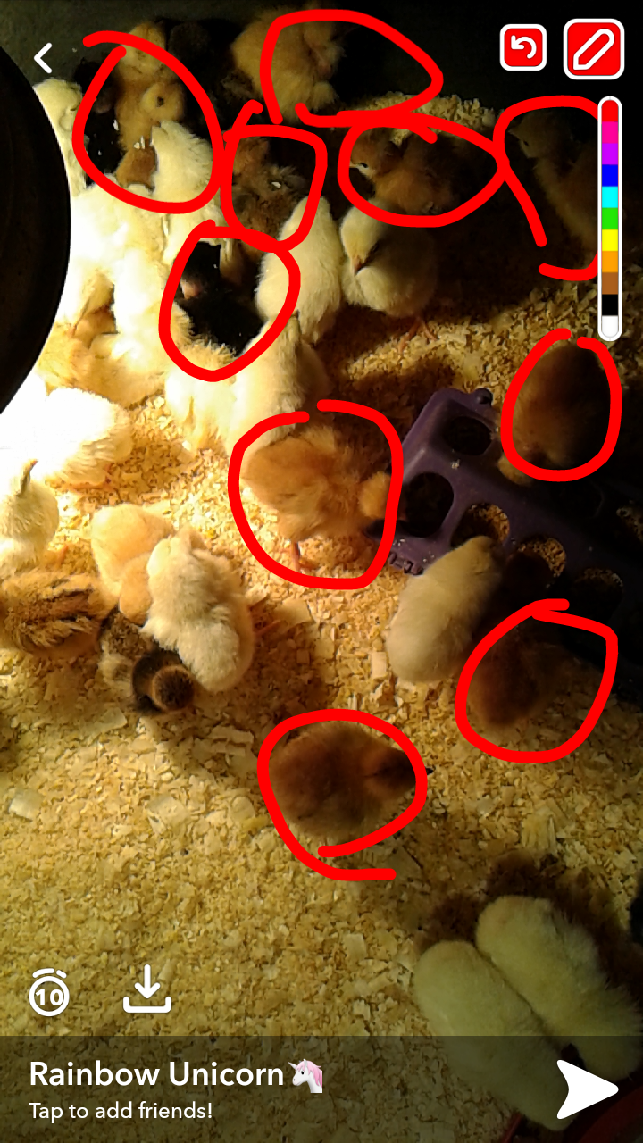All of the birds got today! Black Cockerel Black Frizzle Pullet Blue Pullet All of the chicks I got are sexed females except the free chick 2 Leghorn chicks All 21 Naked Necks All of the chicks One of my favorite Naked Necks. The free chick. I am 99.99% sure it is a Large Fowl Buff Cochin I circled some of the NNs 4 of the 21 NNs The 2 golden polish