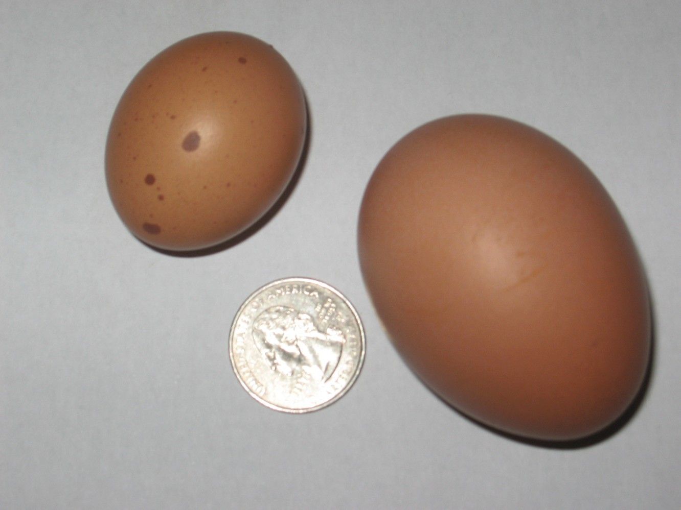 Charlie's egg is the small one. The larger one is from one of my Delaware hens. (I have a couple Delaware hens that lay a darker egg.) Notice the speckles on Charlie's egg. Not expected!