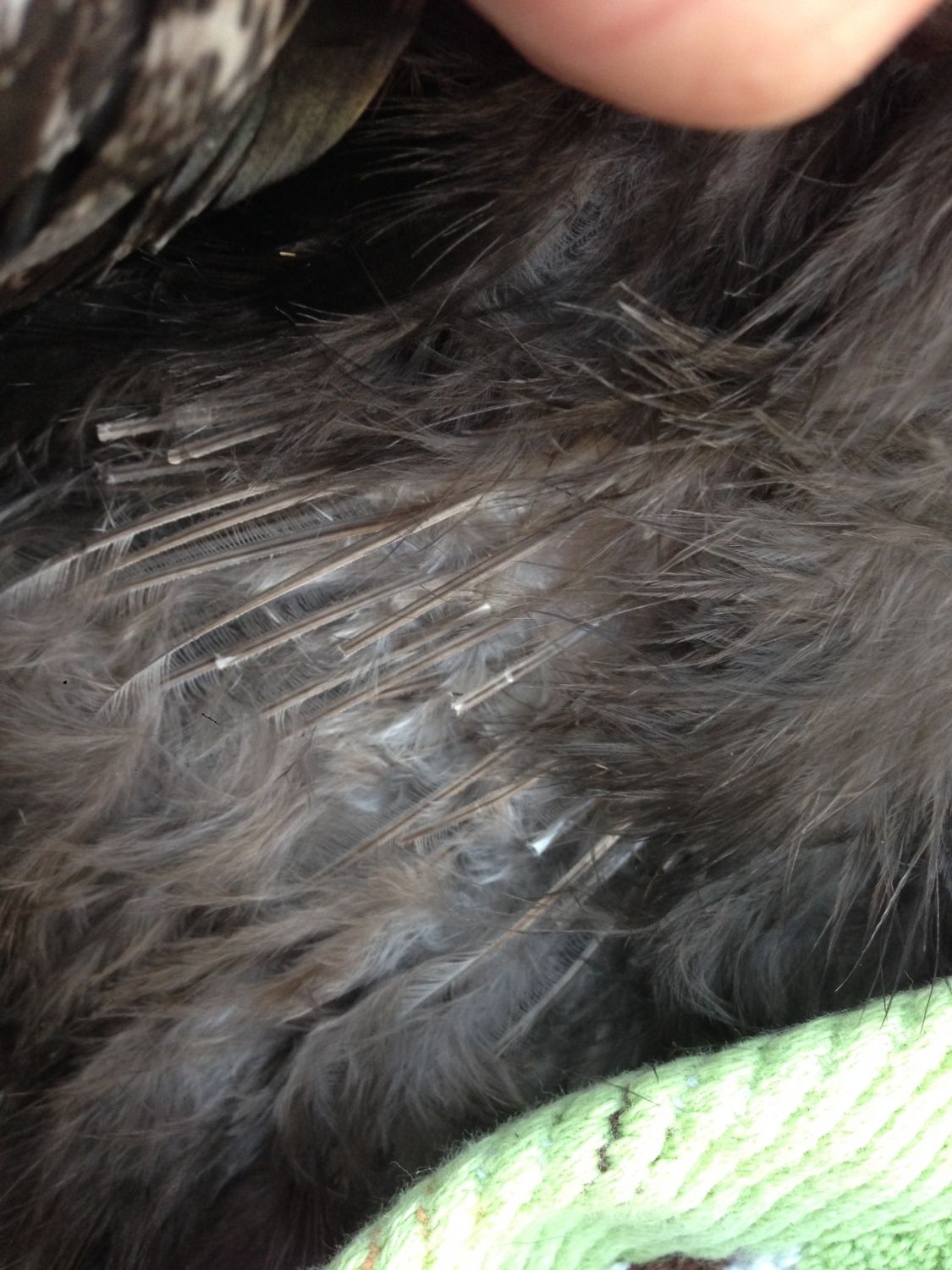 Hi, my oldest chicken is concerning me a little. About a month ago I noticed that her fluff feathers had not lost the sheathing around them. I brought her in, gave her a bath and helped remove the sheathing. Now they are all fluffy and look good (I will add that she did not have about 75% of these feathers before due to a lice problem over a year ago so I am happy to see that her little bum is covered!).