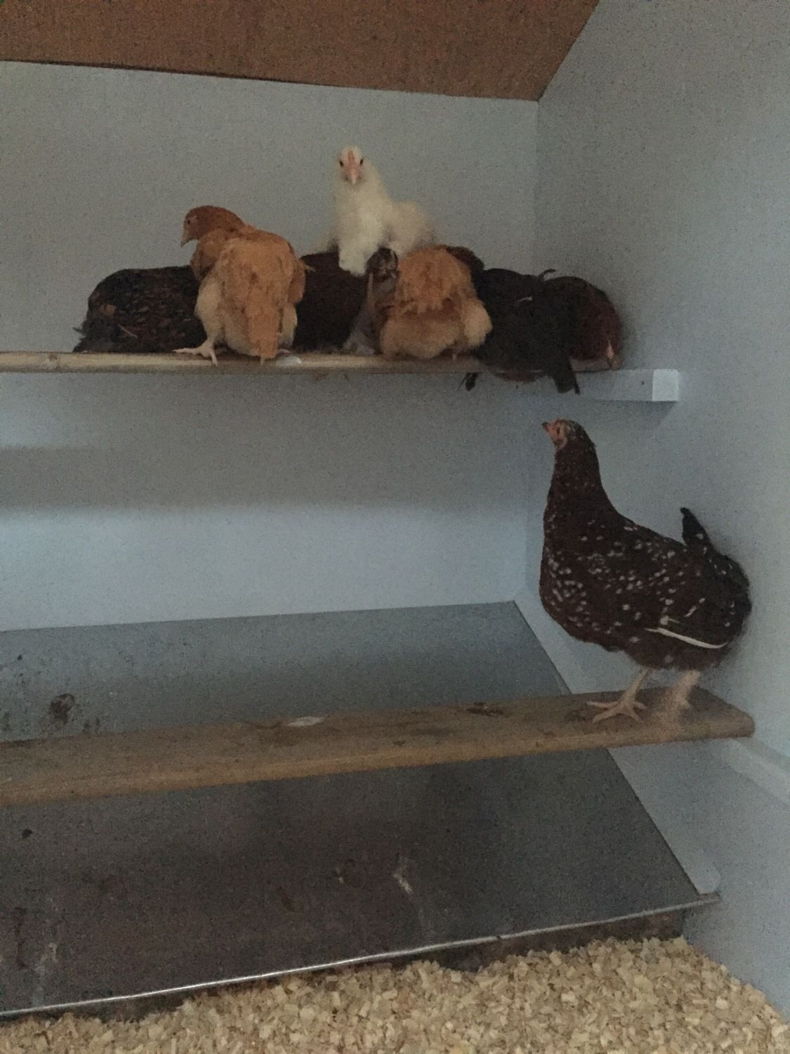 We are placing them on the roosting bars ( 1" x 6" boards, 44" wide , one is 14" from the floor, the other is 28" from the floor) but within minutes they are in the boxes...... having said that...... tonight 3 have stayed up on the top roost. Buff#2 , Welsummer and White Rock