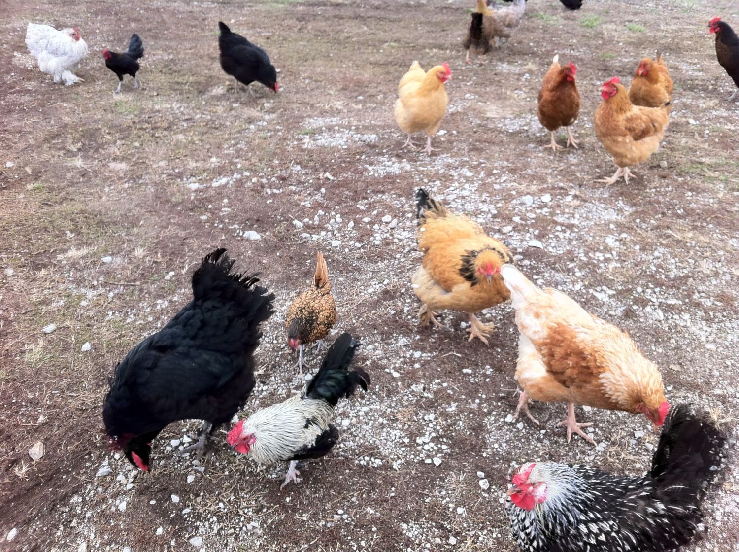 I found a really bad photo of my old flock! these were from 2-3 years ago. the little bantam roo got killed by his son, and one of the red ones (chloe, my very favorite) was killed by a hawk/owl. everybody else is still alive though!