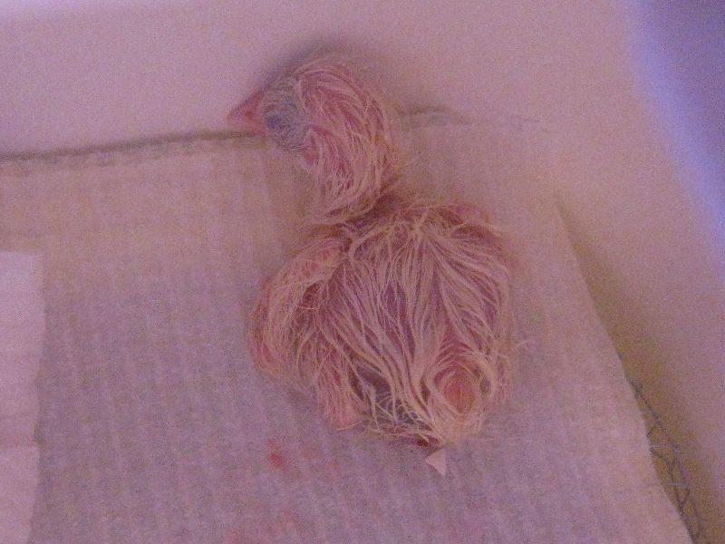 Then, the upsidedown pip that I had been messing with. Sinde the other one hatched, I waited a few more hours, but the membrane was getting dry, so I eventually removed it and took him out. He still had stuff in his belly, and he bled. It looked awful! But her turned out to be just fine. Lesson learned, leave 'em alone if everything else looks good (good looking membrane, could breathe, leave alone! LOL. I should not have peeled back the shell, and exposed the membrane causing the rest of the troubles!