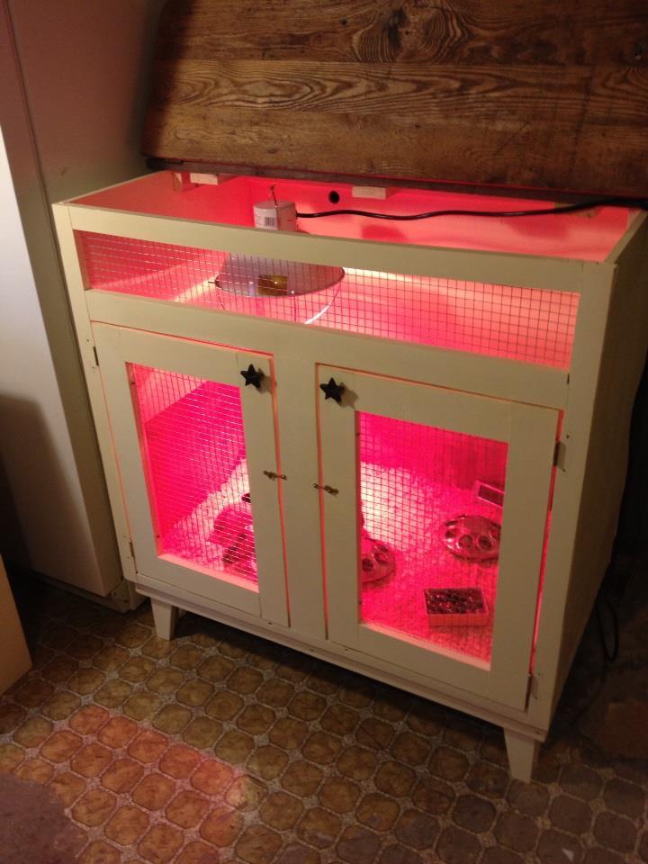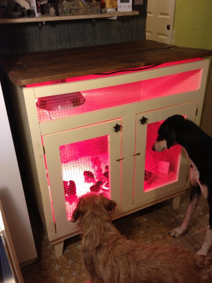 Finally ... a photo of my babies in the brooder cabinet! I have to find the right drill bit to make the cord hole in the back, which is why it is coming out the top right now. Other than that it's ready for occupation. Top will be added when I get a round tuit. The top hinges open and there are removable plexi-glass panels inset in the doors to keep drafts out when I open the mudroom door.