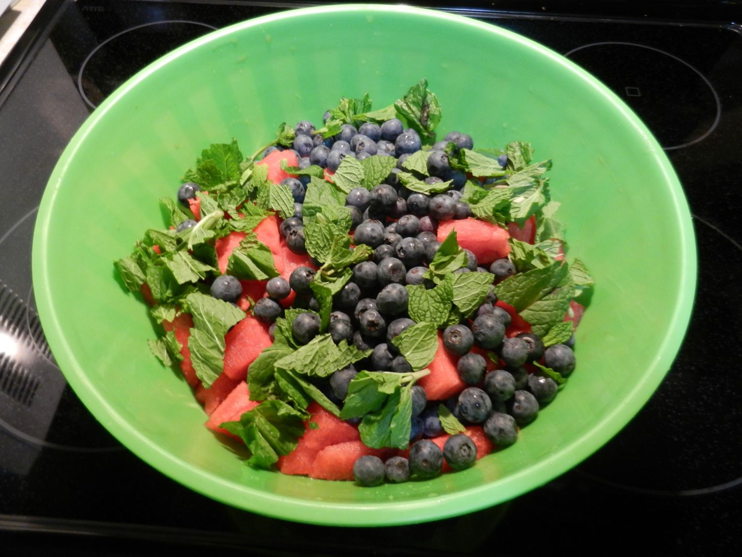 . I cut up some watermelon and mint then added some blueberries (and I got the mint and blueberries from my garden).
