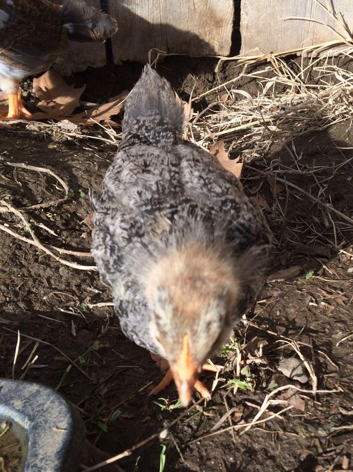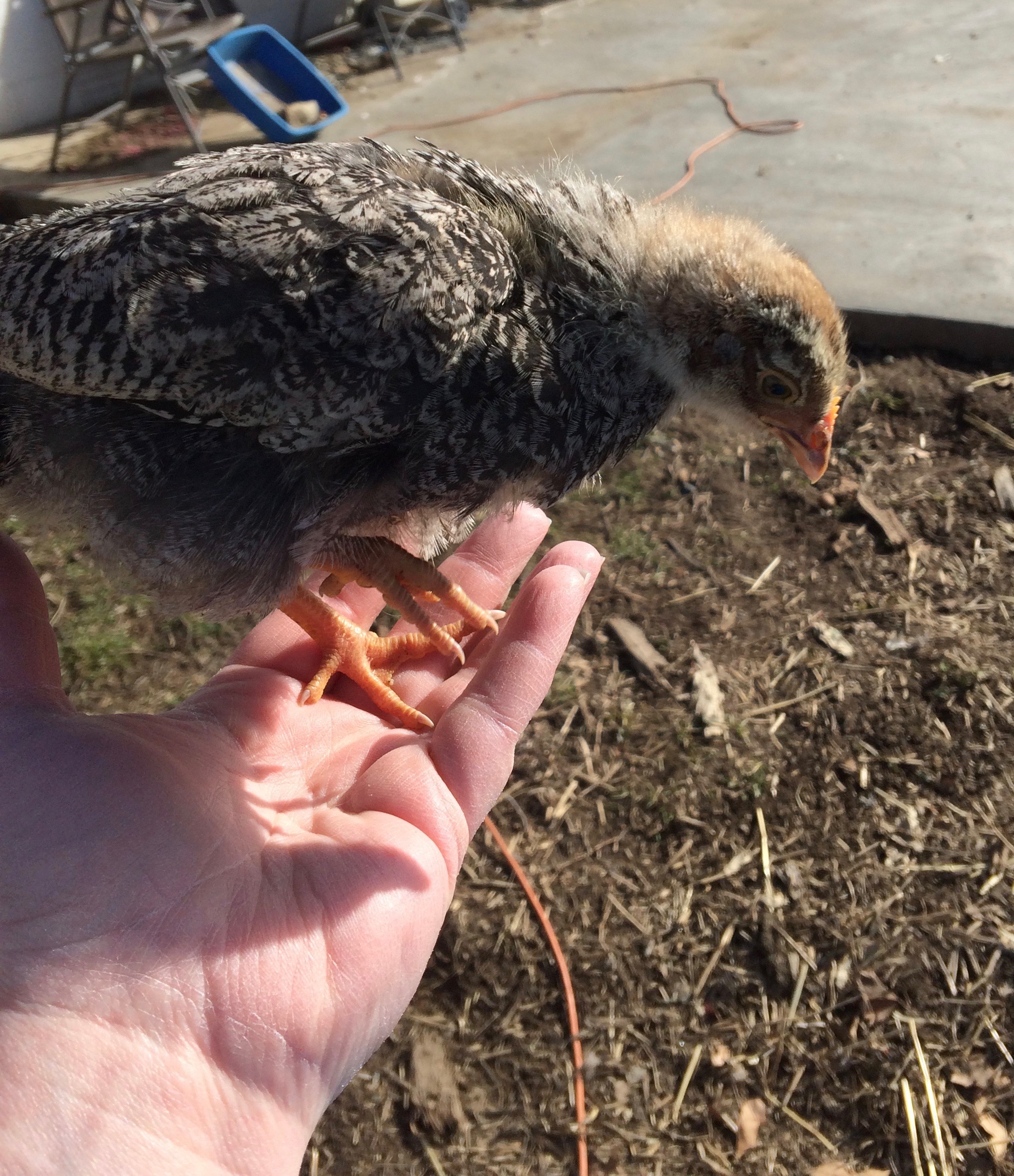 Can anyone tell me the gender of this chick? I suspect it's a roo, but that is just because this is the friendliest chick I have and I'm not supposed to have roos so I would hate to have to rehome it. I'm guessing that 5 1/2 weeks might still be a little too early. He/she is the independent one of my group, the first to go check out something new, more willing to be held than the others and I often see him/her off by himself while my other 3 stick together. I can try to get better pics tomorrow too, he would not stand still for a pic.