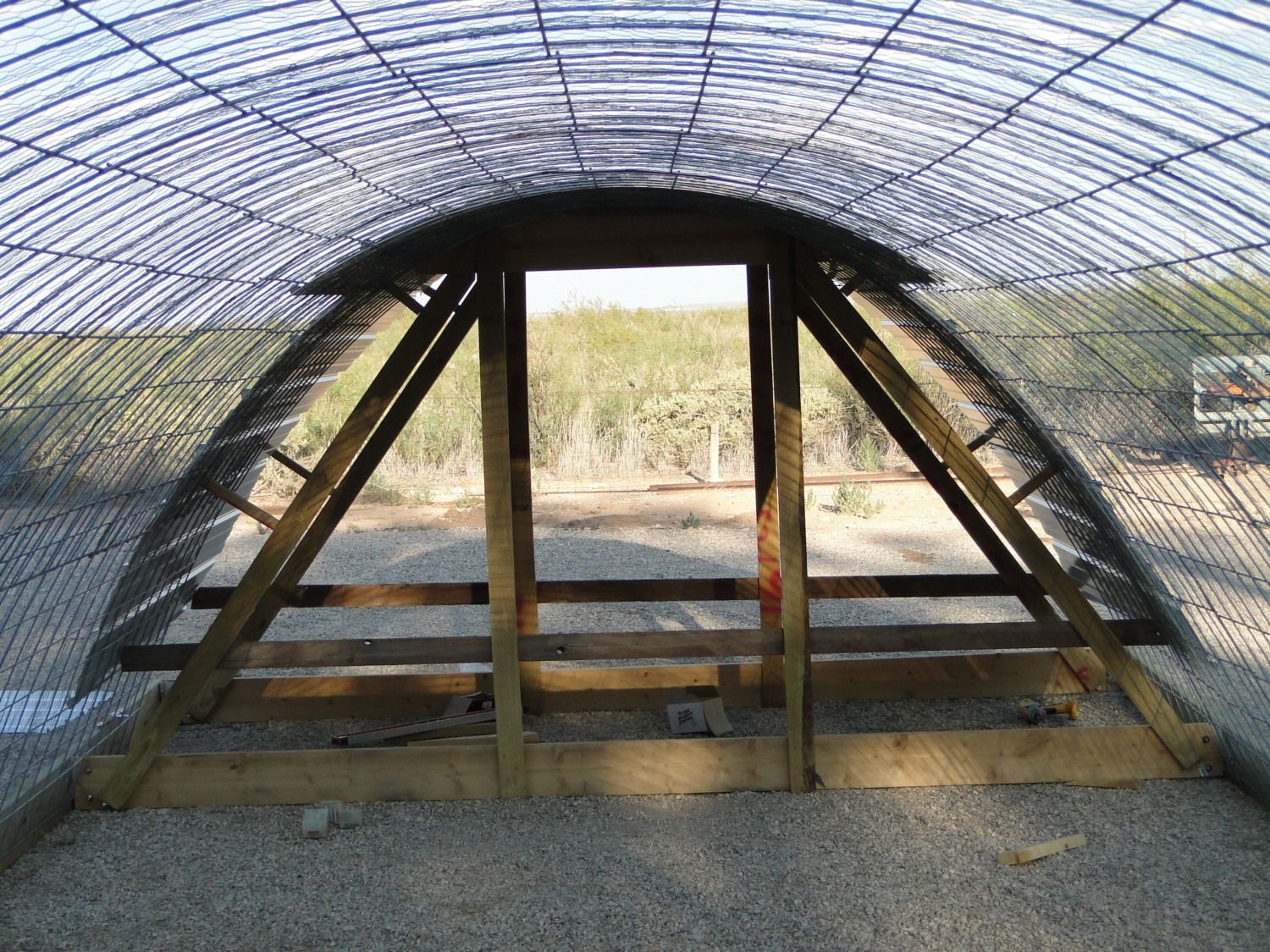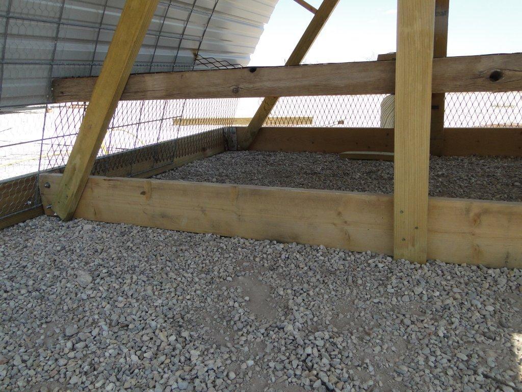 Notice the metal on the inside of the 2x6. This is why I had to crawl to the inside to staple it up. I thought about putting it on the outside, but thought it looked better on the inside. Plus, it overlapped with the chicken wire and cattle panels better this way.