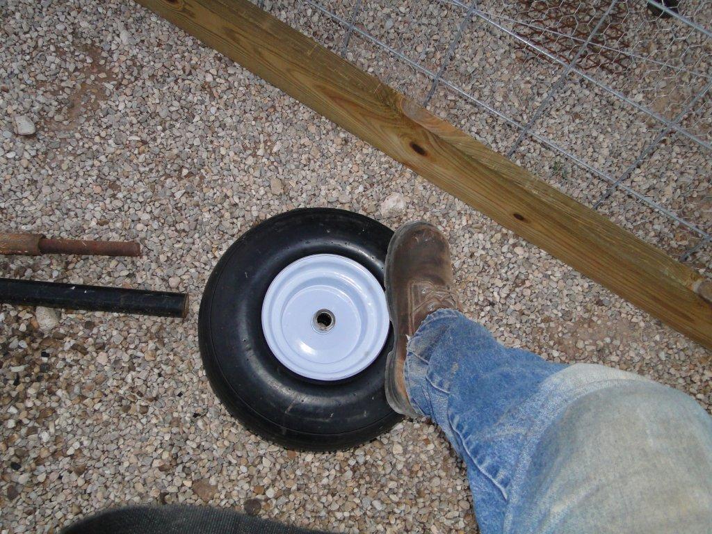 What? Somethings not right. I started lifting er up, the pipe went up and the tire went out... OUT?? Why not down??? Because there's too much weight being lifted for a tire that's that far out being held by a 20 yr old peice of 1/4" channel iron that bends toward the cattle panel when lifting up. TOOOOO MUUUUCH TORQUE.