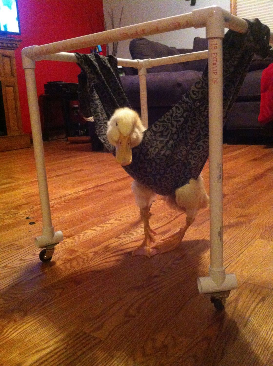 Yes I took him to the vet and she thinks it was a niacin deficiency in the beginning and also from being on a slippery surface for a short amount of time. Then he went through a major growth spurt and the leg that was always somewhat twisted inward couldn't support him anymore. So it splayed forward and he held the other behind him to try to support. He just kept growing and couldn't keep his legs under him or walk at all. So she suggested switching him to a maintenance diet so he quit putting on so much weight and lots of swimming because it would help him use his legs properly without weight on them. Also flipping him over and working his legs like manually holding them where they belong and moving them as if he would when walking to work the muscles. She said that she saw a whole flock of swans that had the same problem and with lots of "swan fat camp" and water therapy they all were able to get their legs back under him and walk again. So... I changed his bedding from pine shavings to indoor outdoor carpet which helped a bit with the slipping until it got wet.. But it was easy to spray off with the hose when dirty and change with new. And lots of swimming and I also built him a walker that he would sit in a lot to keep weight off his legs. He didnt walk in it too much but he did try some. I think just keeping the weight off is what helped the most. And it eventually got warmer outside and I was able to move him out where on the grass he has lots of traction and actually can keep his feet under him. He walks kind of.. Bow legged and pigeon toed.. But he walks and he could not before at all. I don't know if he will ever be totally normal but he gets where he needs to go. My other duck keeps him busy because they refuse to be apart. And he's able to get in and out their pool that's burried down in the ground. Hope it helps!!