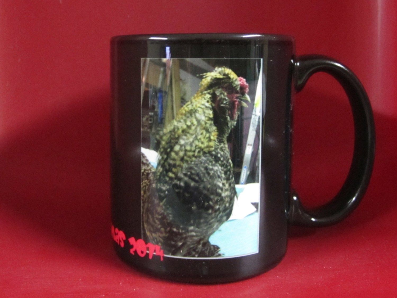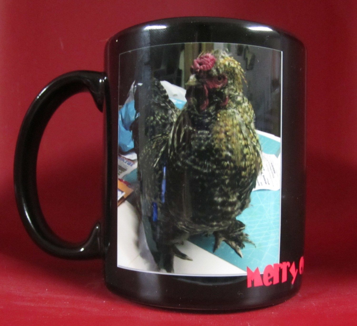 My friend made me a Christmas gift! Earlier this year I ordered some Speckled Sussex eggs to hatch. I was accidently sent Silkie mix eggs and this was one I hatched. My friend now owns him. He reminds me of an old hippy with a beer belly. He's so ugly, I laugh every time I see him, so she made me this mug.