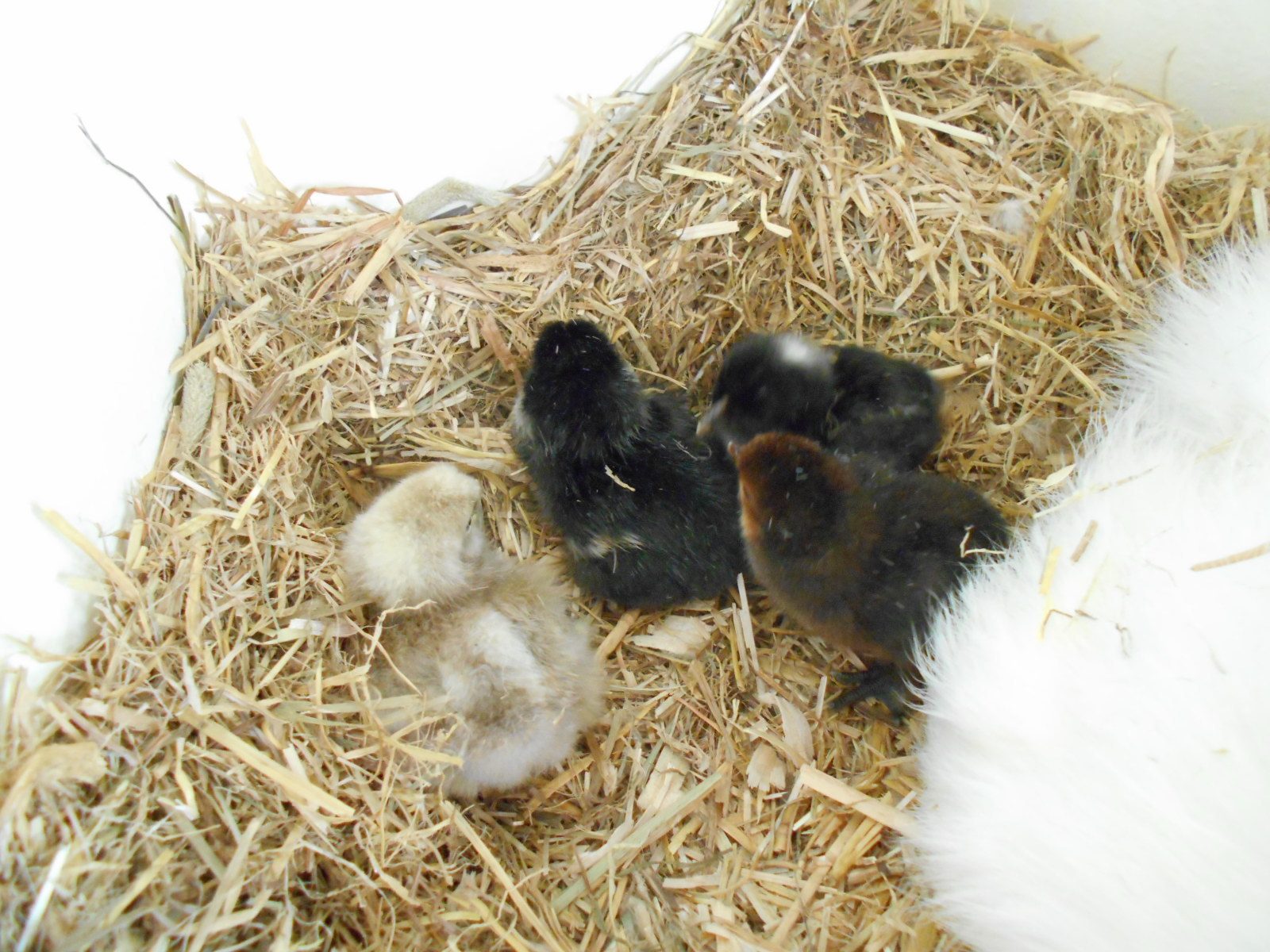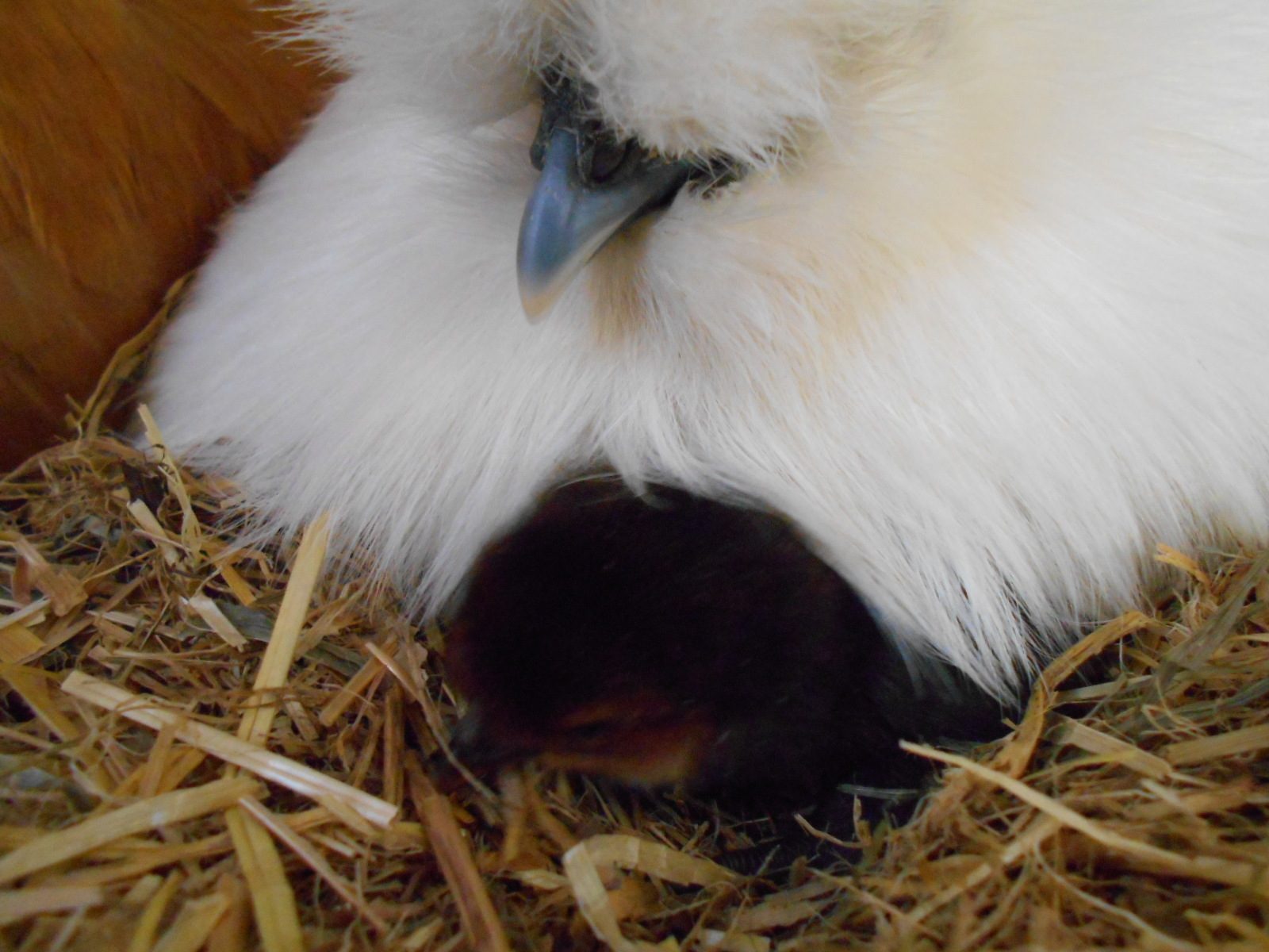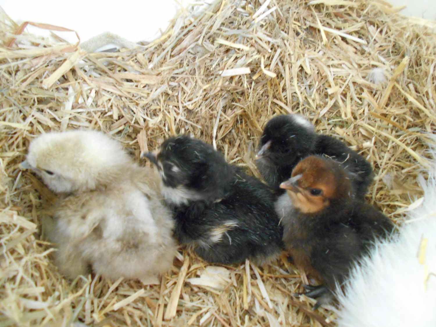 This pic and the one below shows the first chic to hatch. It is a Silkie mix. Came from a Silkie egg and has feathered feet but does not have 5 toes.