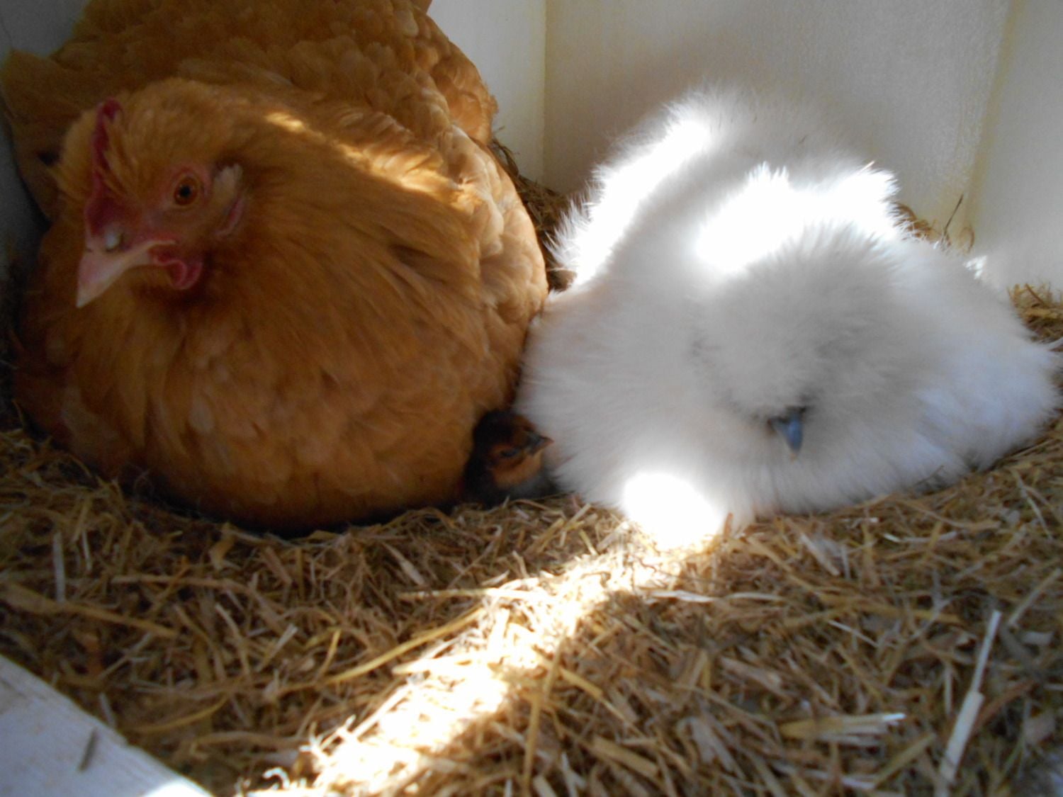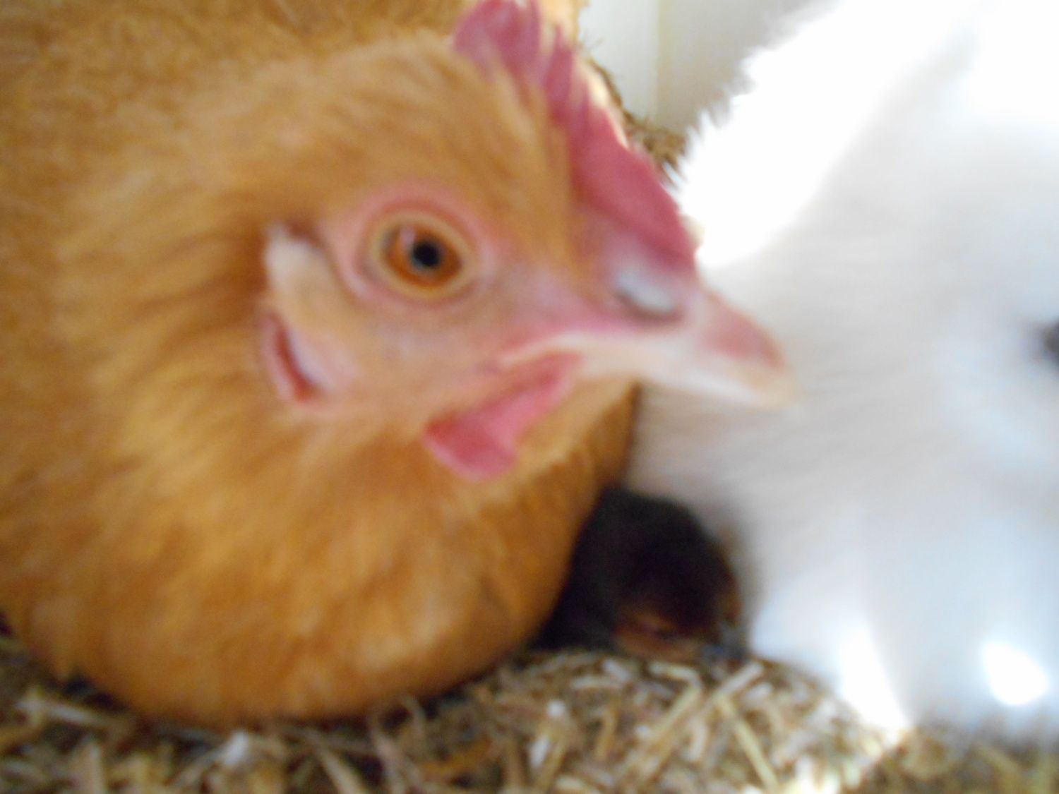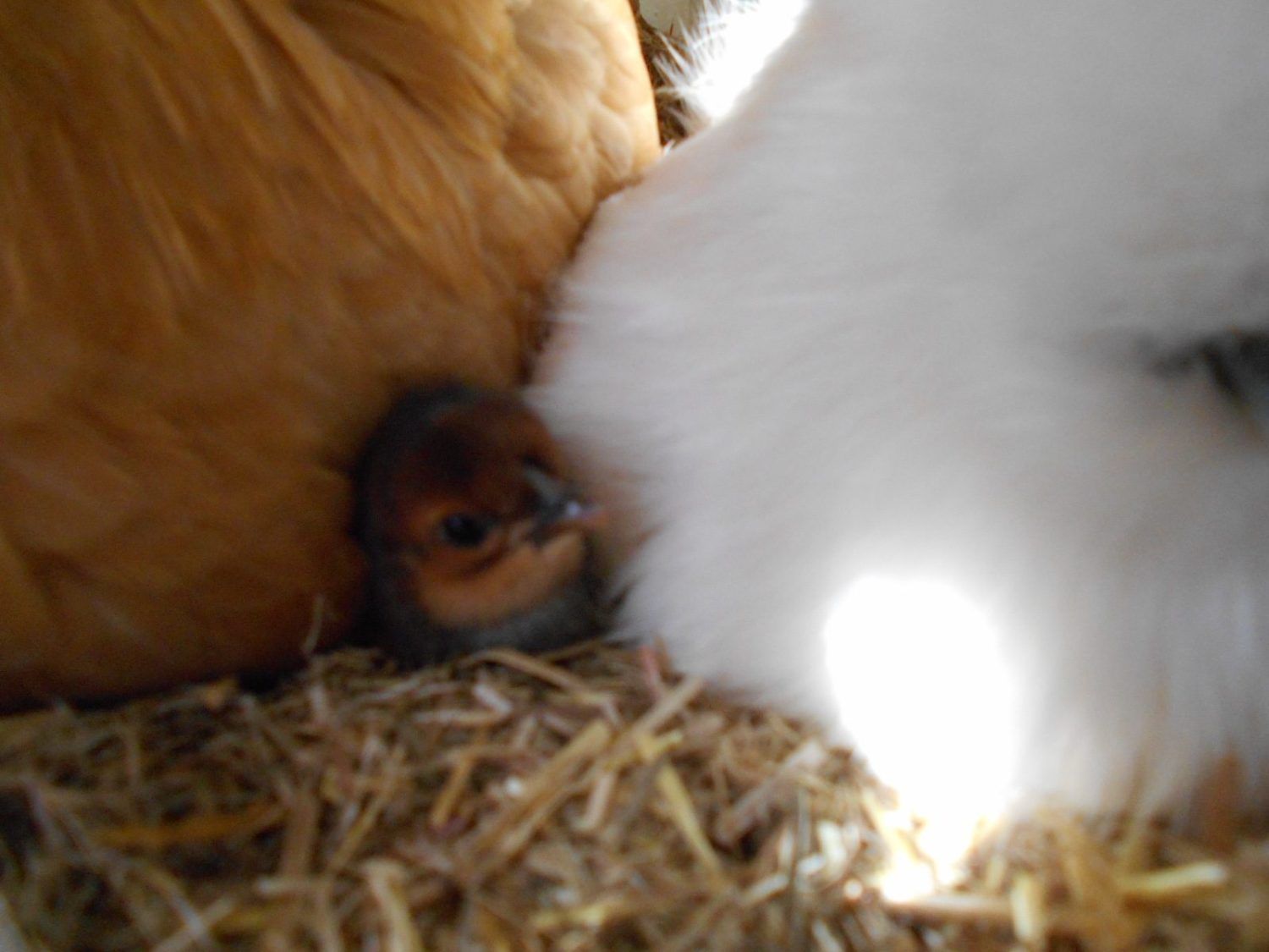 This pic and the one below shows the first chic to hatch. It is a Silkie mix. Came from a Silkie egg and has feathered feet but does not have 5 toes.