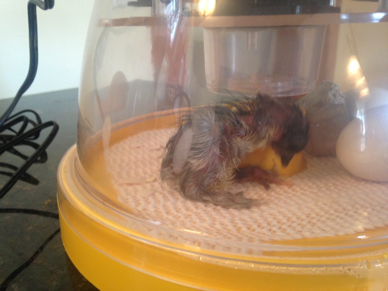 Now he is just drying in the incubator. Running laps around my mini. Toppled over the one egg I had in a carton and hugging both eggs that are with him. Peeping up a storm. I don't any of the peeping is coming from the other eggs yet.