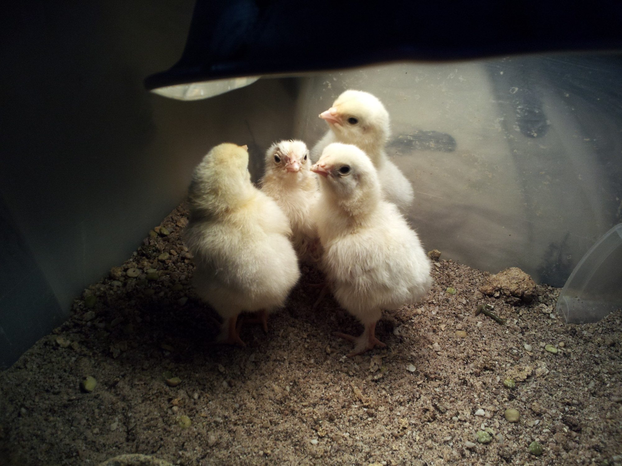 Well, he's been in with the others for more than 24 hours and while he is easy to pick out, they're not picking on him - though he gets run over a lot - and he's trying to keep up/imitate them! Maybe he'll pull through after all... it took about half a dozen attempts to integrate him before it "worked," and I am SO GLAD they're all together!!!
