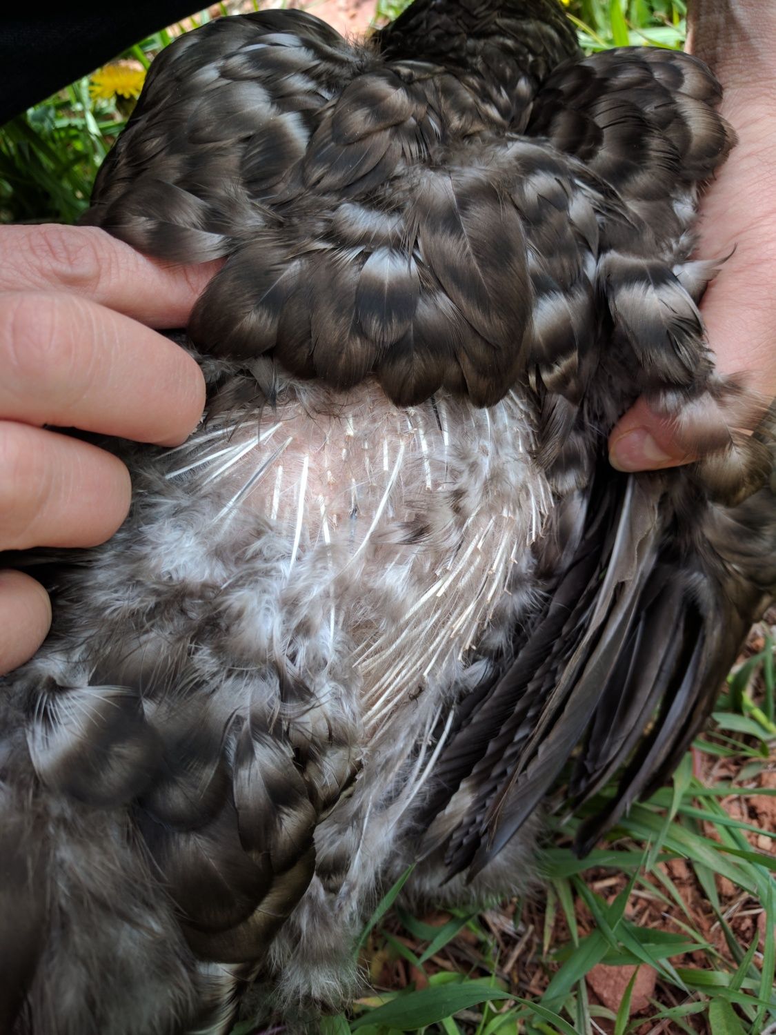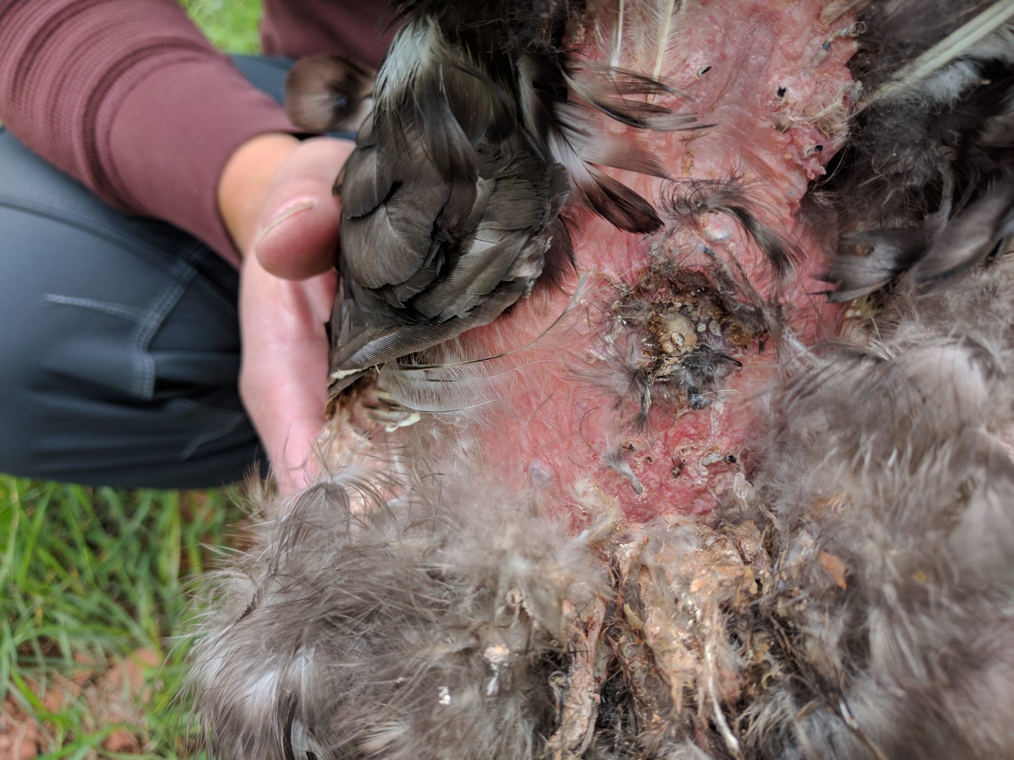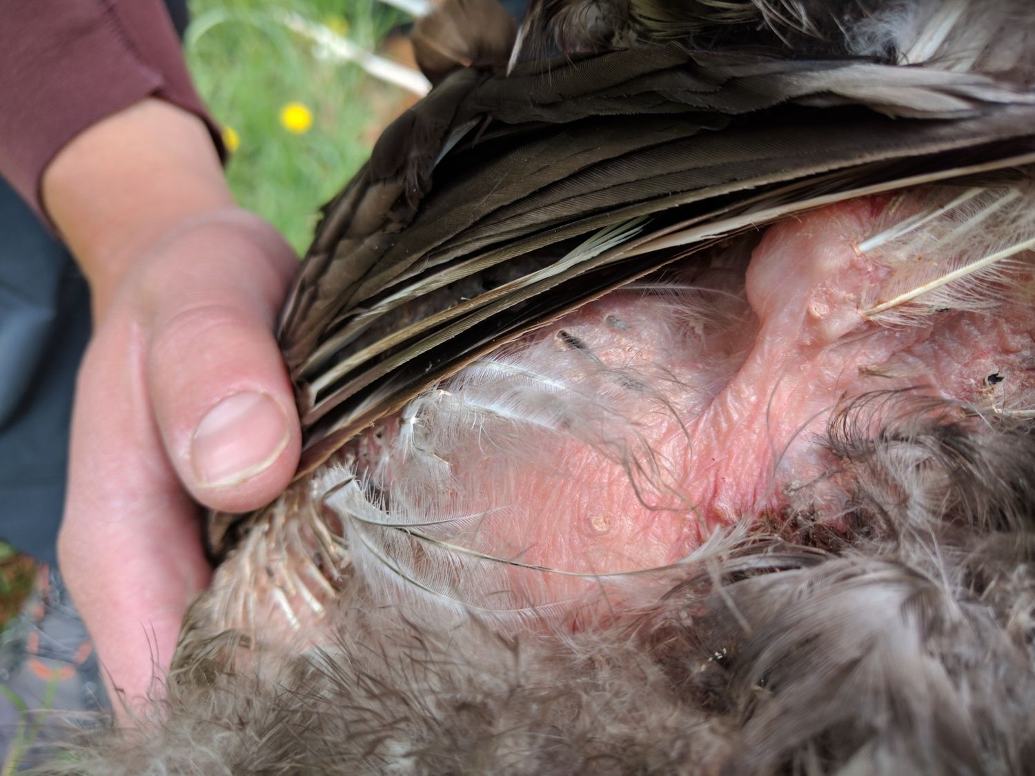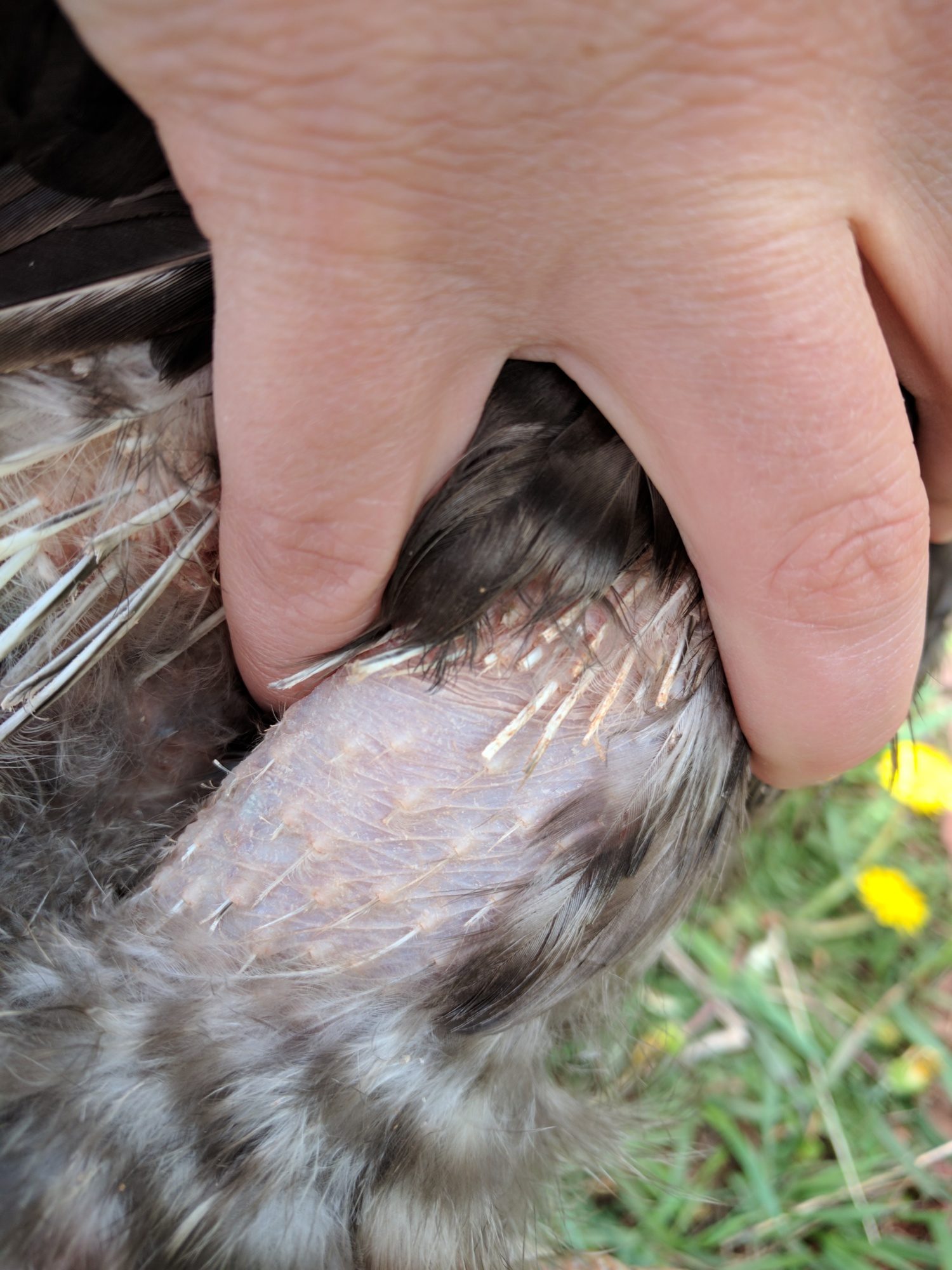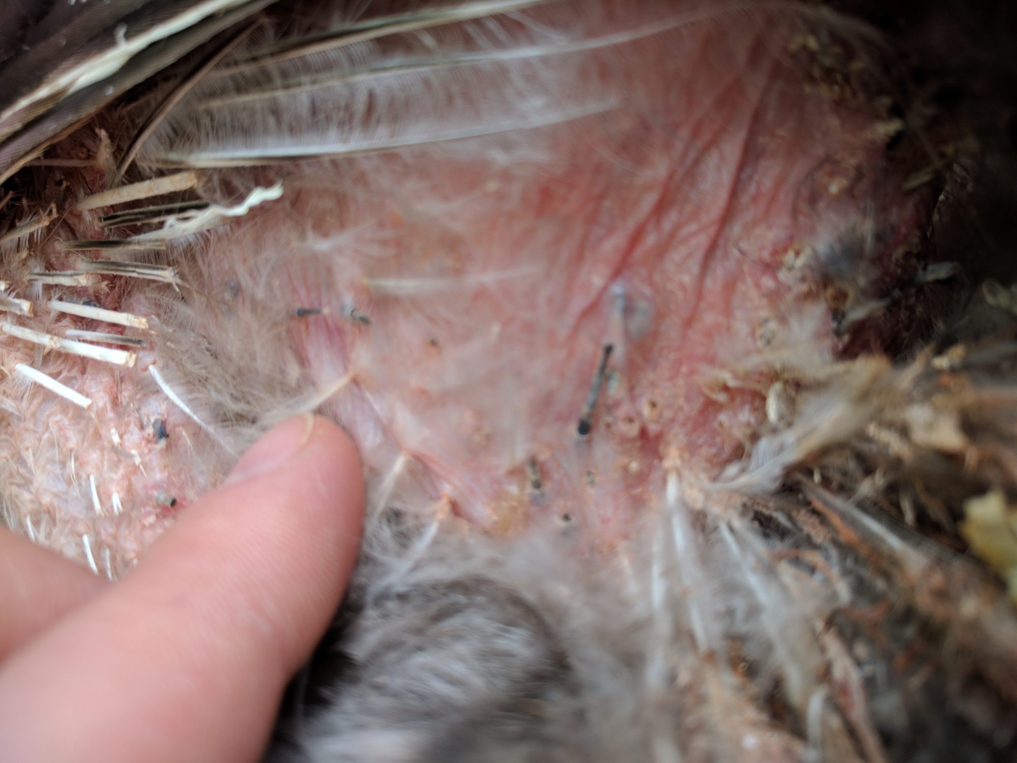 Okay, I'll go cut stuff off and will bring out a wipe to clean her up again... Alot of her feathers are breaking, like right now, she has two feathers hanging off that are broken. Not sure if that means anything. And, she has these bluish (bloody under skin?) looking spots. You might be able to see it in the vent area picture?