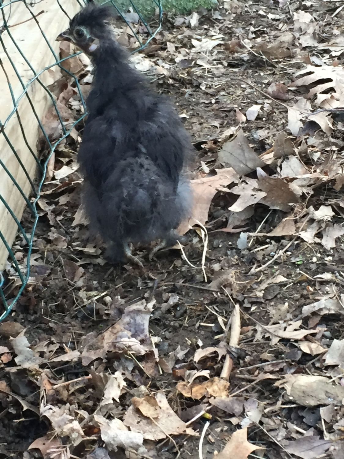 She is all black with feathered feet and a weird tuft on her head. Don't mind my little naked neck she is nosy.