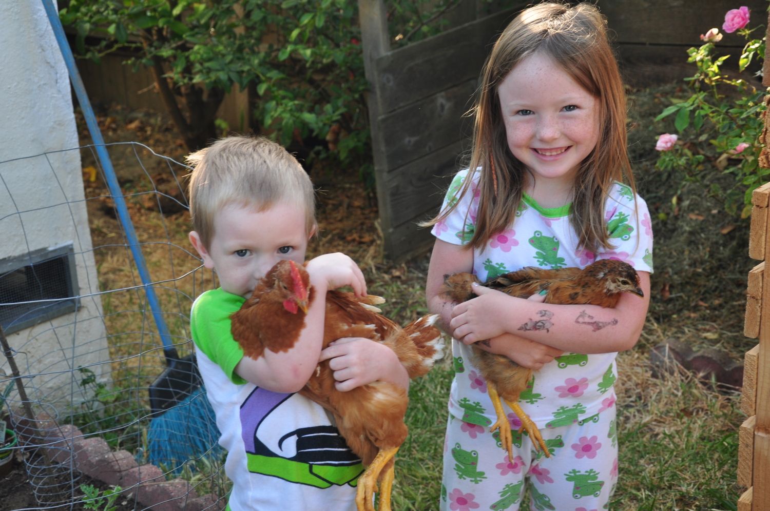 The two favorites...we are pretty sure the one my son is holding is a rooster. The one my daughter is holding is a complete mystery to us. It is the only one that doesn't look like all the others. The second picture is also the suspected rooster. He(?) is the leader of the pack, definitely the dominant one in the group.