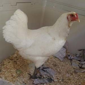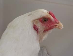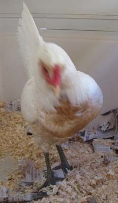 She is predominantly white, with a reddish brown chest, and a little red feathering around her comb. Her legs have a light olive green tint. In the few days I have had her she is laying (daily)a very lightly tinted blue egg of around 50gms. Temperant wise she seems flighty, but, I suspect she had never had any handling.