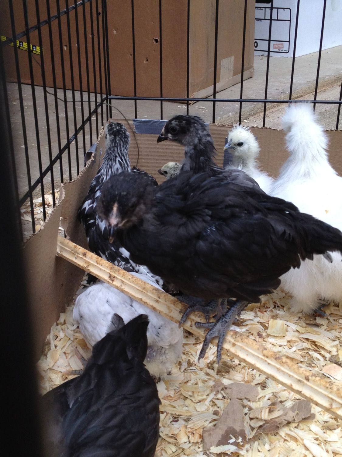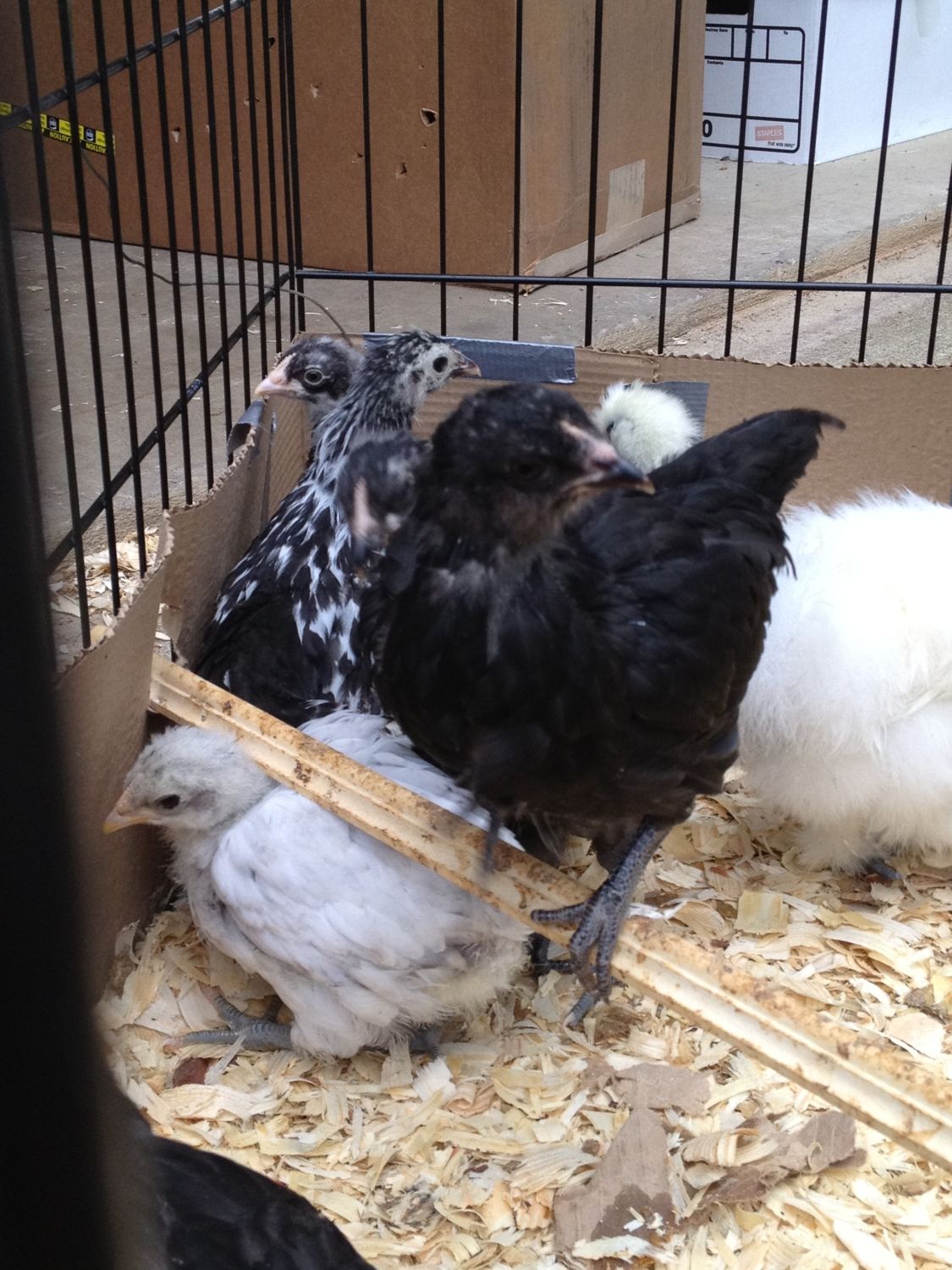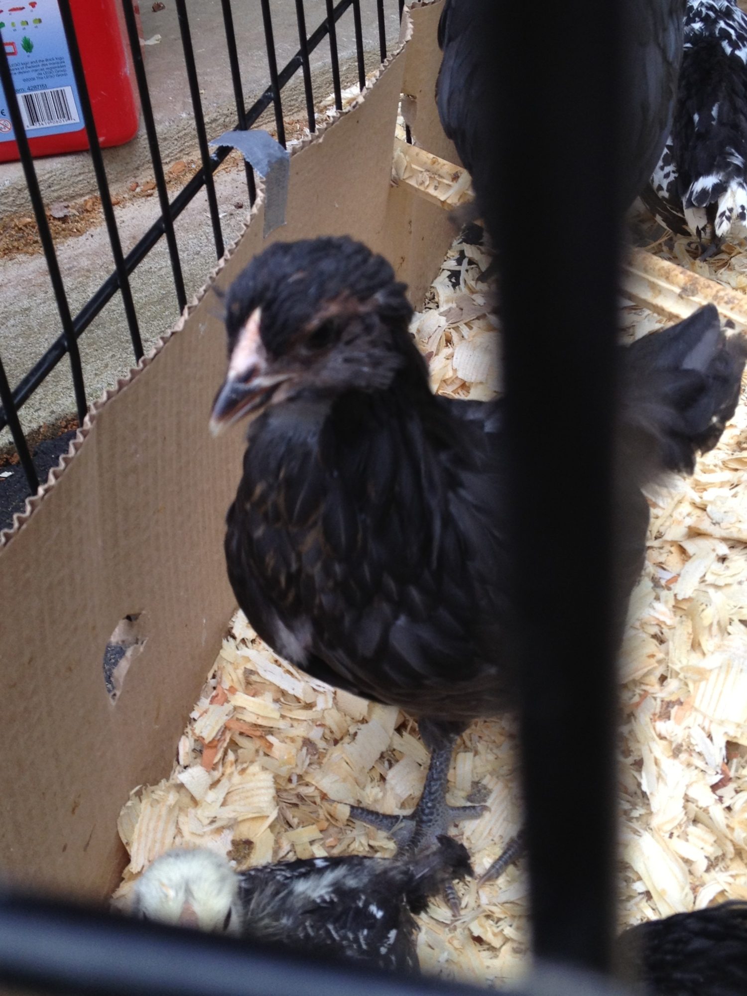 I know I butchered that spelling! Sorry!! I can't really tell the Ameraucanas from the Black orpington anymore! Lets see if anyone can gess the sex of these chicks - I'll try to post better pics when I get them later today... The Blue orpington is a roo, I'm convinced. Ginormous legs!!