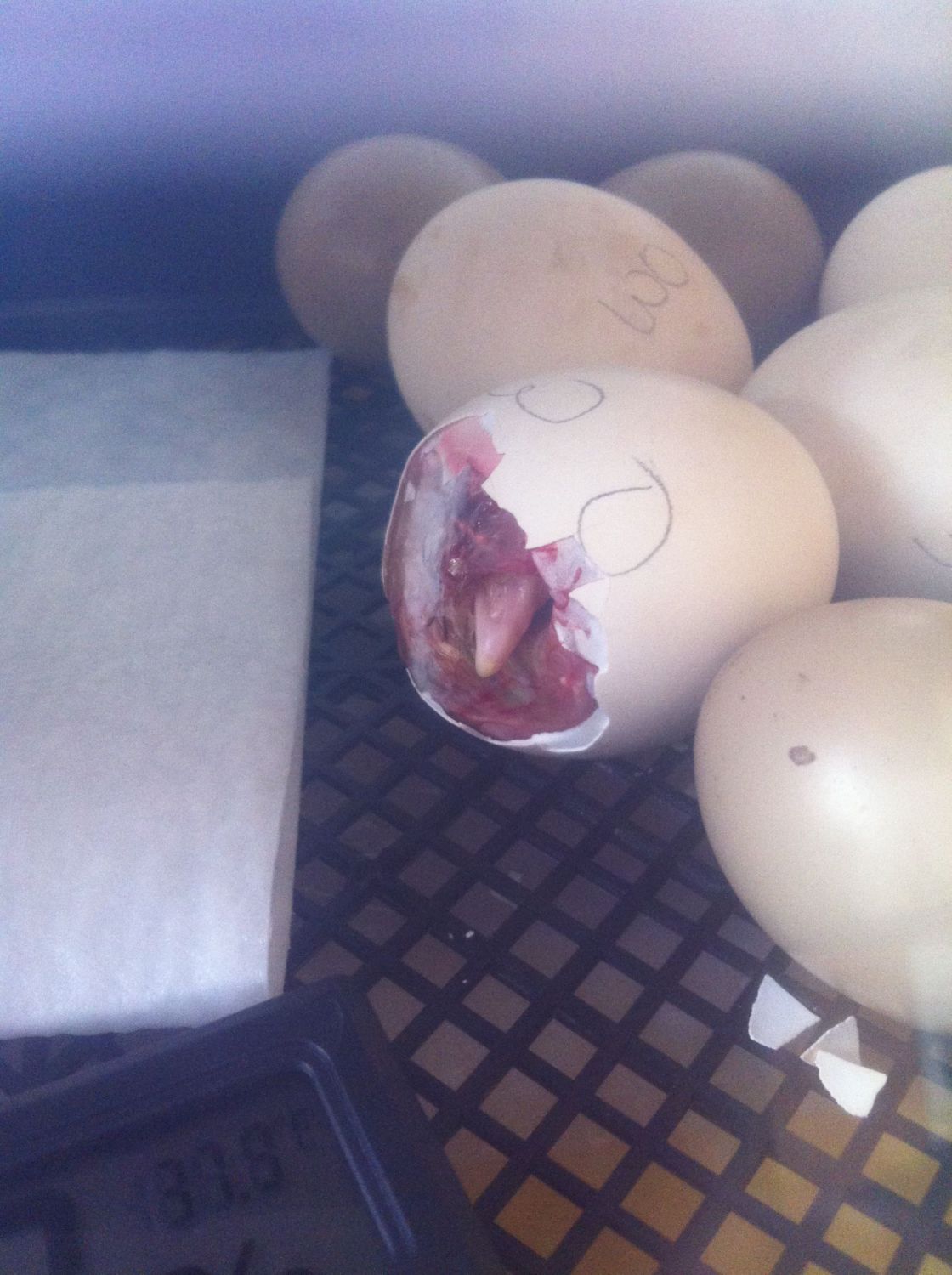 crap send me a picture. let me see, when is the due date???I did eggtopsy on my unhatched all were gone from low humidity except 1. now the egg is open and the membrane is leathery. what can I do. please help