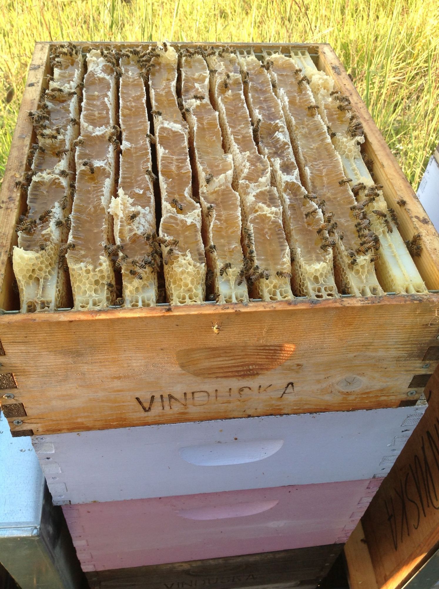 Those are some awesome pics Sgtmom52. Your queen is doing an excellent job. The two hives on the left have a good number of bees, did you put honey supers on them? We are doing our harvest now, looks to be a good one.
