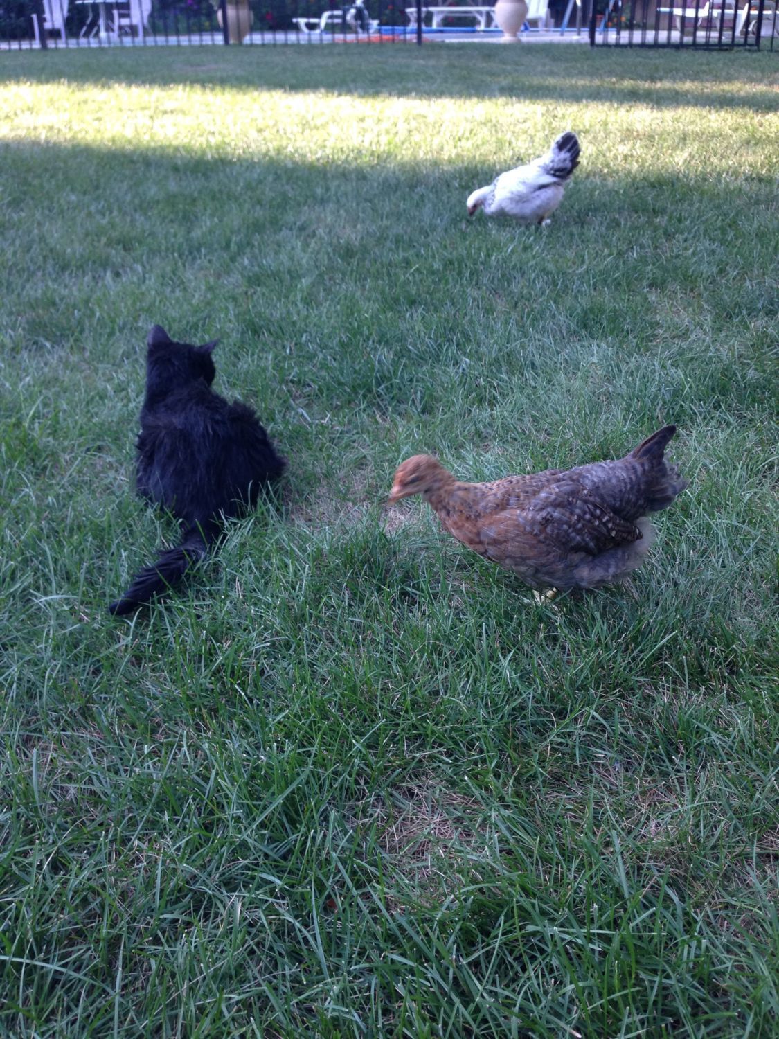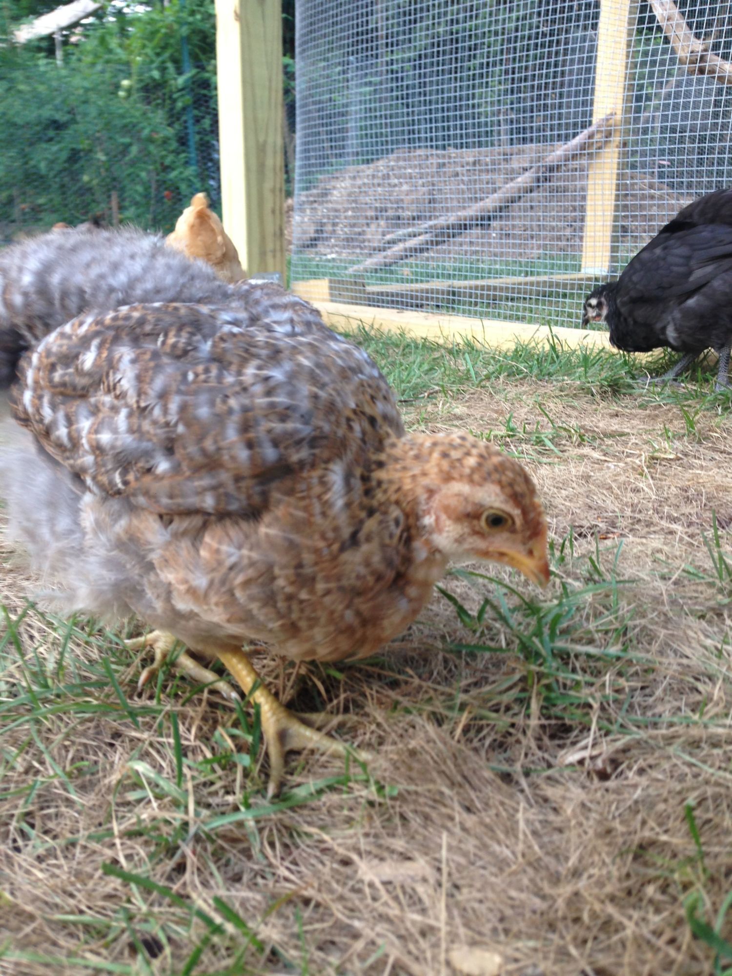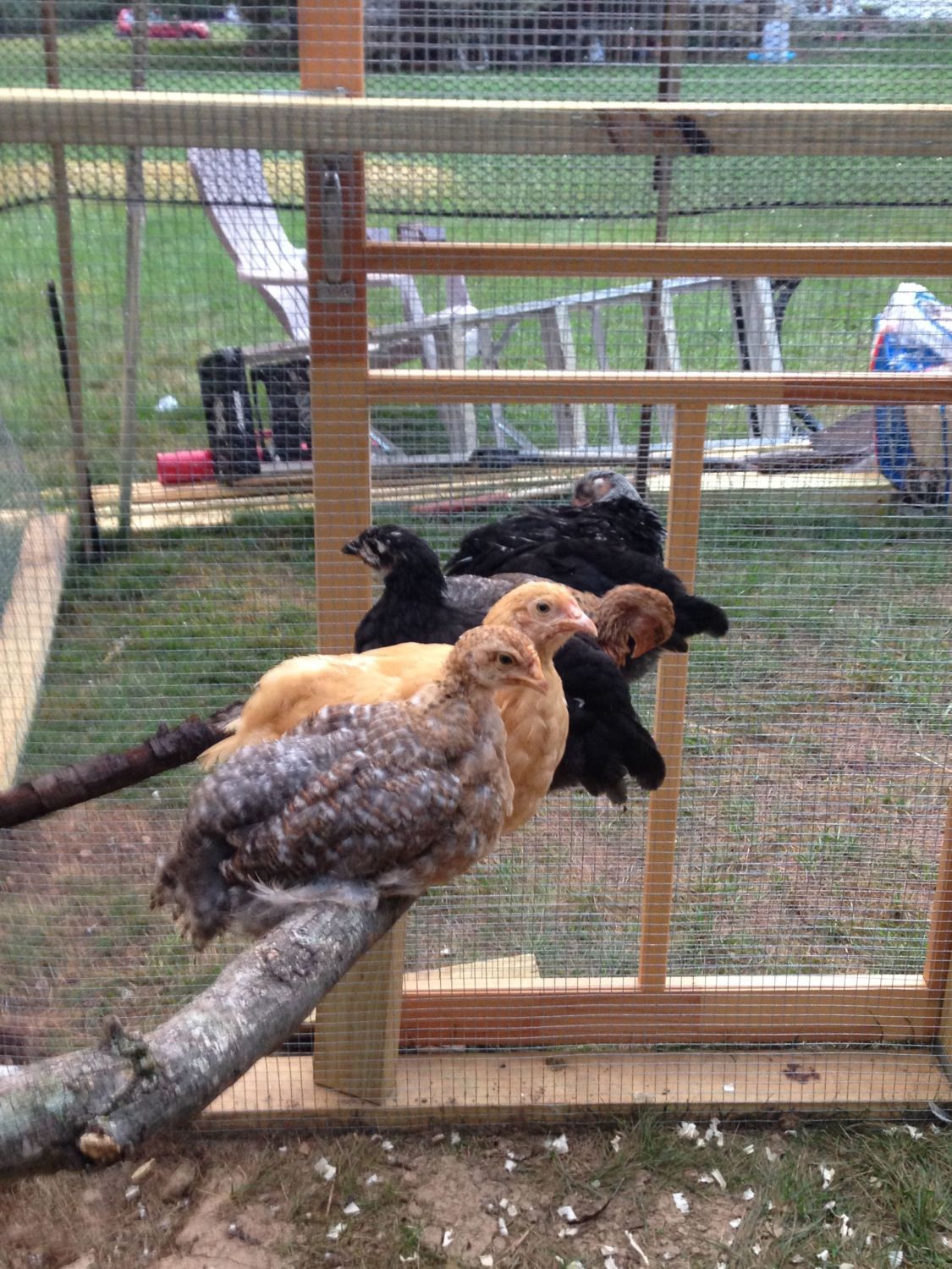 That is one of the 2 Bielefelder girls on the branch. Mixed flock. The day I brought them home. June 22, 2015
