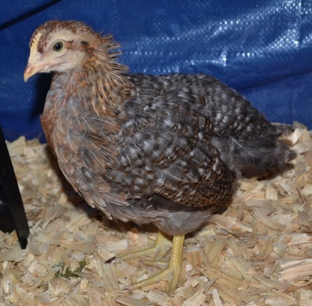Here she is around the time I got her at about 2 weeks old, too, if that helps. She's on the right and the Legbar is on the left: