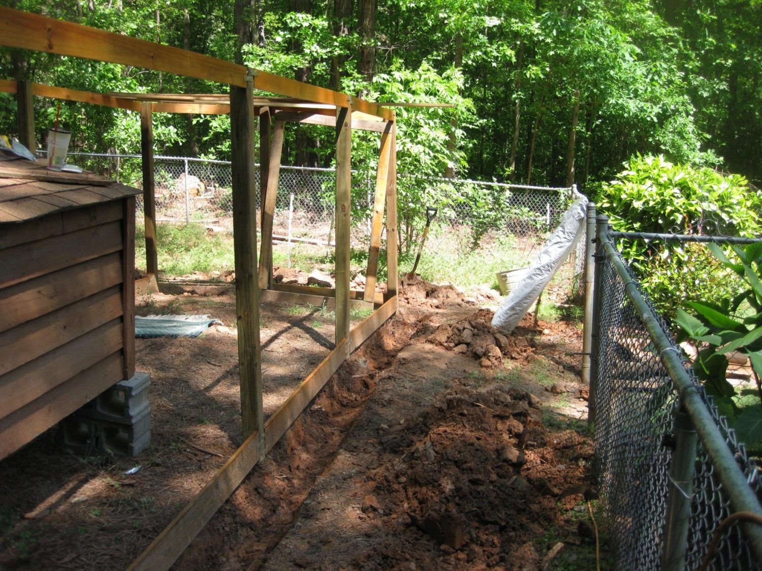 I have since covered the top with 1/2 inch hardware cloth which I overlapped each 4 foot section and secured with wire ties, secured the shade cloth, built a new door for the coop, added a couple of stronger locks and continue to set the trap. I also have covered the back-fill around the outside perimeter of the pen with sand and dried grass clippings so that any night visitors that come calling will leave impressions as to where they tried to get in as an area that needs my attention.