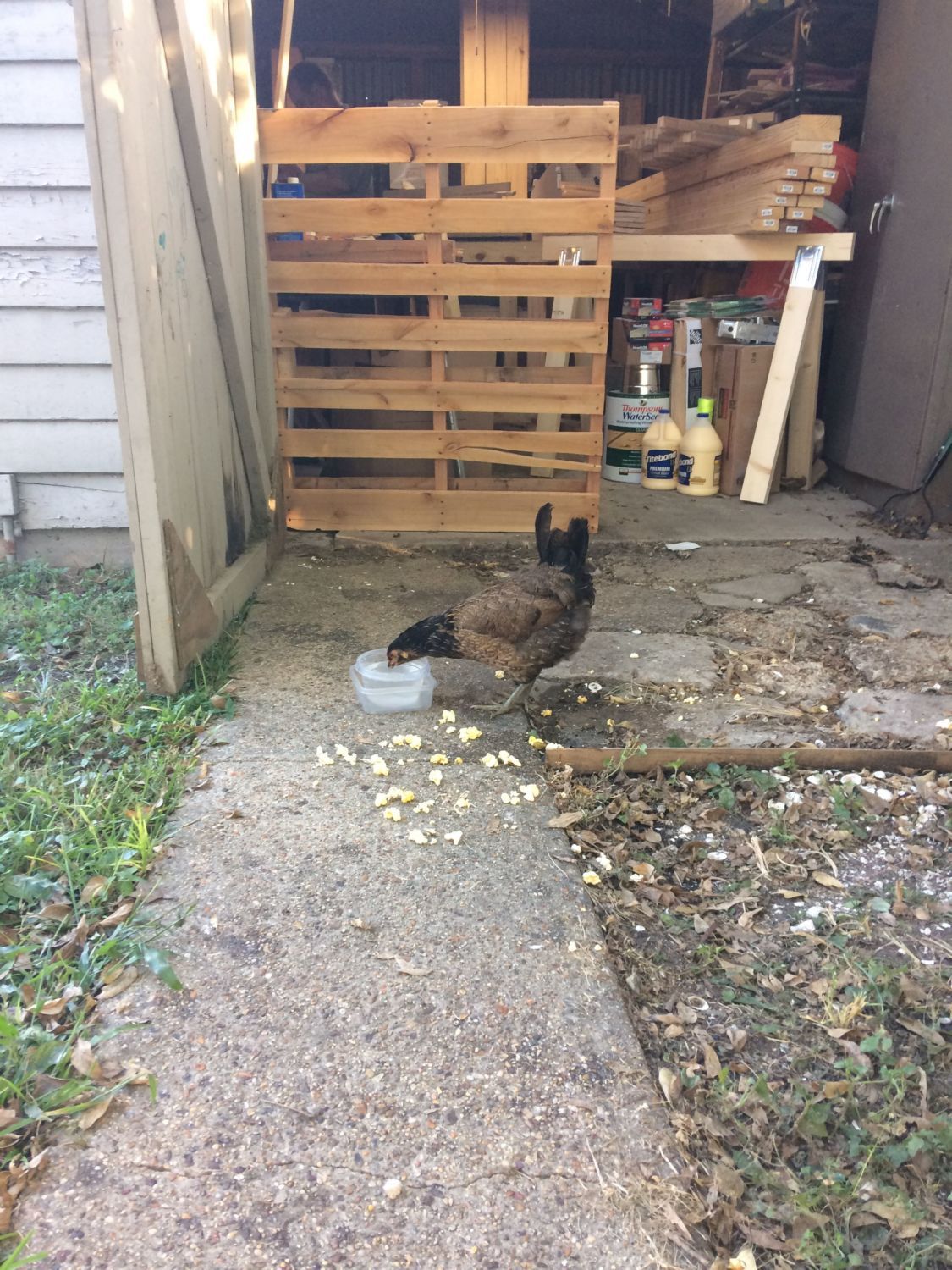 About a week ago, my husband was in his workshed and a chicken wandered up to him and started hanging out while he was sanding wood. It stayed out and about with him for several hours and we locked it in the shed that night after giving it food and water.