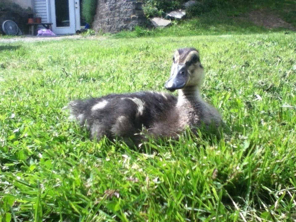 Well as some of you know a couple weeks ago I had trouble hatching 3 duck eggs. 2 had died and only one remained, but had a leg problem. Well today I am happy to say that during his/her first walk (due to the sudden lovely weather,) the surviving duckling is doing much better. She/he has grown about 3-4 times the original size, is starting to get prickly feathers, and follows me around the yard. Here is a pic of the little fuzzball: