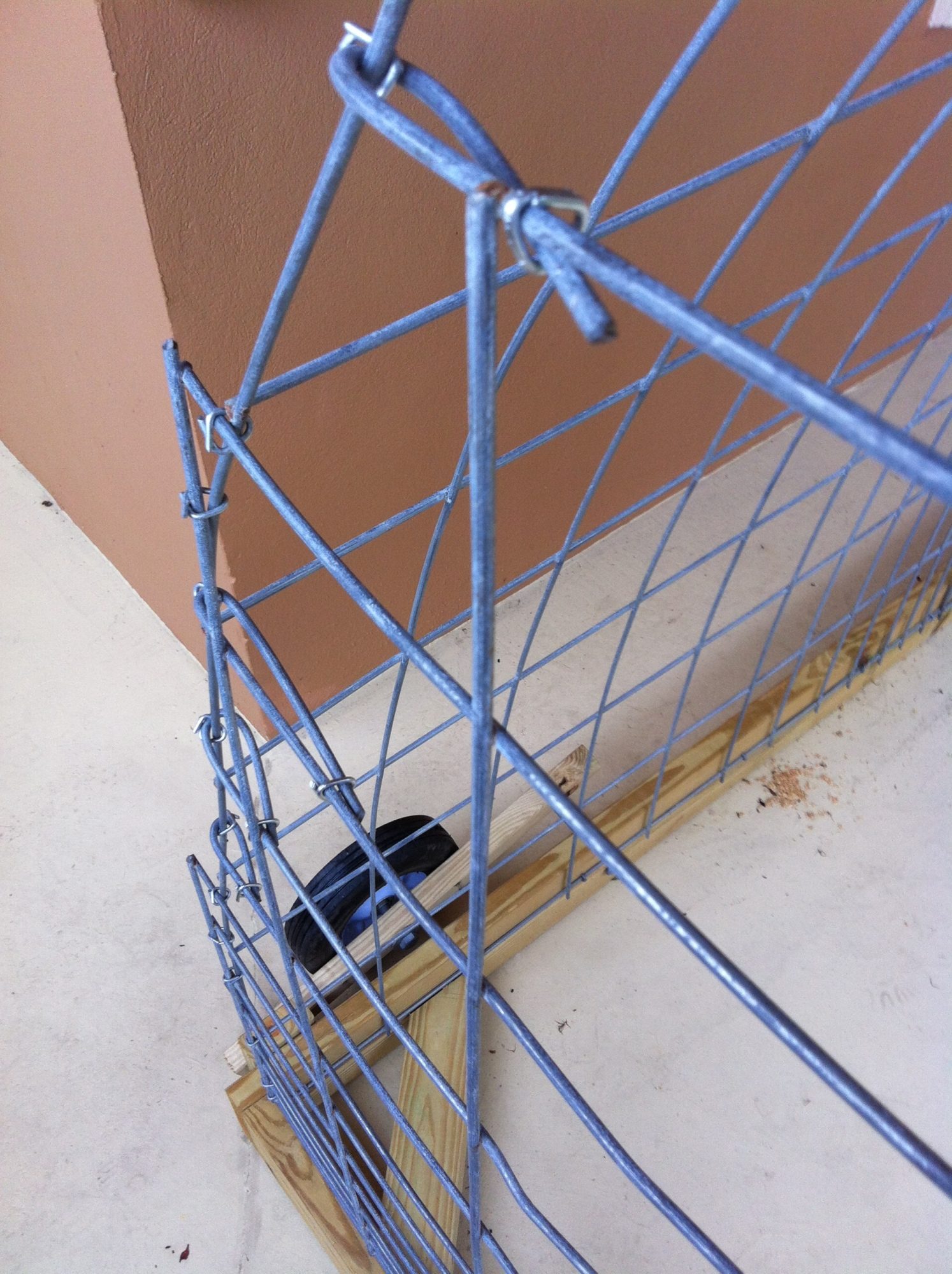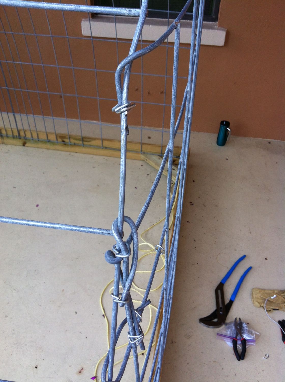 Just for future notice chickens can easly fit through cattle panal you might want to add some chicken wire to it. We have cattle panal with chicken wire and horse panel (2x4) squares that small chickens can get out of about a month old hens. And cats and other predatures like raccoons ect can get in as well.