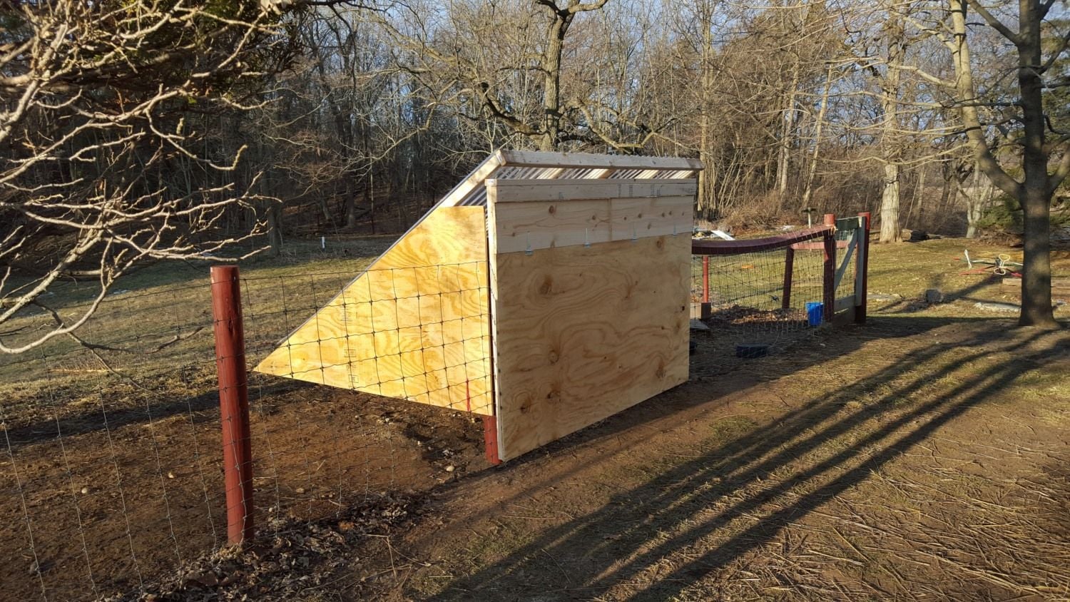 This is near the house and hopefully somewhat protected from predators. I did buy a predator guard electronic eyes that will hopefully ward off brave raccoons which we have in the area. Goats share this space so the plan is for them to help guard too.