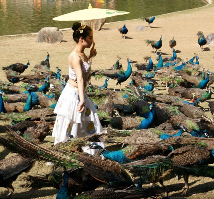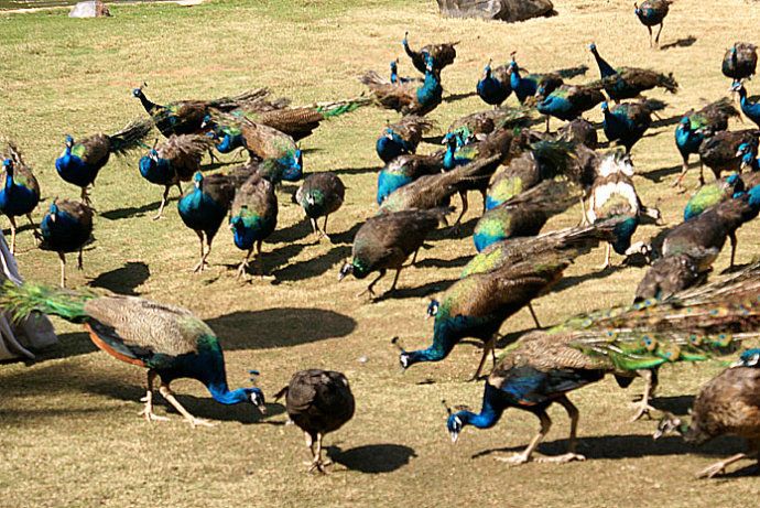 Dozens of buses arrive every hour full of tourists ... the dancer throws rice into the grass ... the peacocks arrive from everywhere ... they are hungry!