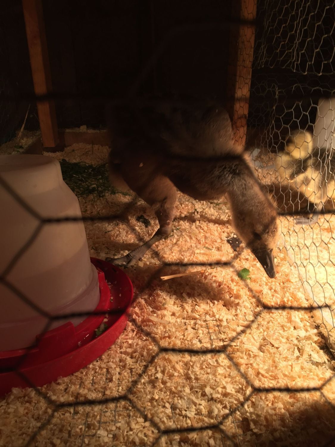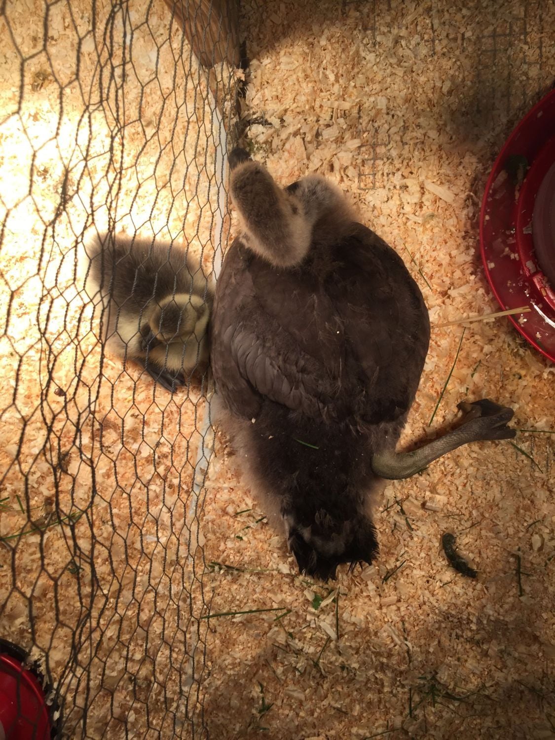 I have a flock of chickens and this year I ended up getting a baby African goose from a friend about in early April. I couldn't get another goose pal for him until the 13th of this month so I bought him two Pekin ducks to hang out with until then. So I have a 5 week old African goose, two 4 week old Pekin ducks, and a 5 day old African goose. Tonight when my boyfriend and I got home there was a goose abandoned in a box by our front gate, no note or anything. I think it is a Canada goose that someone tried to raise but failed so they abandoned it with me. I think she may be 4-6 weeks old because she is getting a lot of her adult feathers. Her right leg is the most problematic as it has grown in completely wrong, almost backwards. She can get around awkwardly but it looks painful. The left leg is less problematic but still not 100% normal. From what I have read this is a vitamin deficiency so right now I am feeding her Chick Starter that is 19% protein and supplementing with Brewers Yeast. I also gave her plenty of fresh grass and a little bit of chick grit. Her right wing appears a little funky as well. I was just wondering what to do to help her or even if I can.