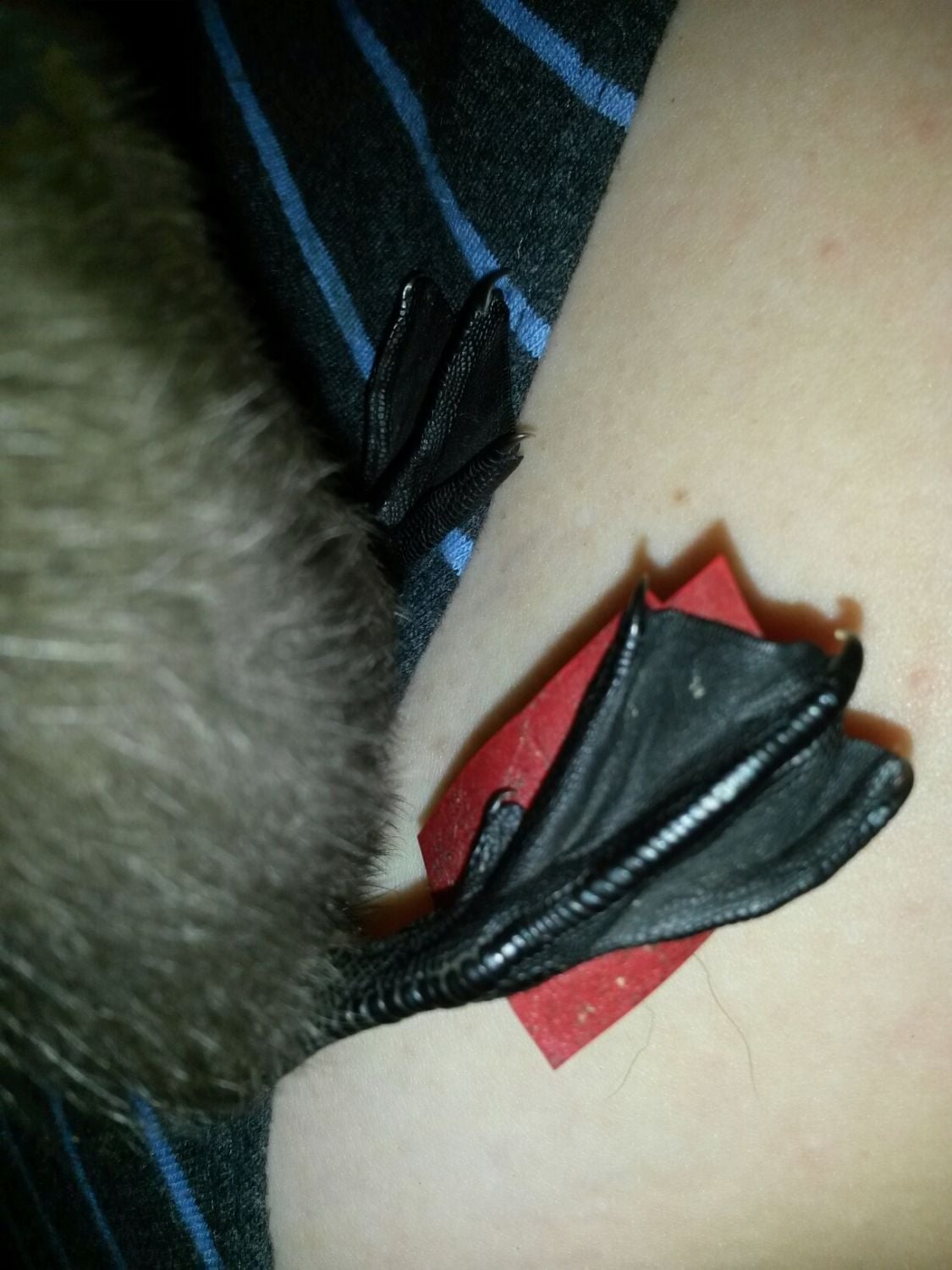 The foot is being held open by a piece of electric tape. It looks normal to me too. He does put some weight on it now, but the leg does not extend like it should. To me it looks like something is out of place at the "knee" joint. (Sorry I don't know the correct term for the joint) The joint almost looks backwards or sideways compared to the left.From those pics, his foot looks FINE? Hes not using it at all? the injury has to be higher up.