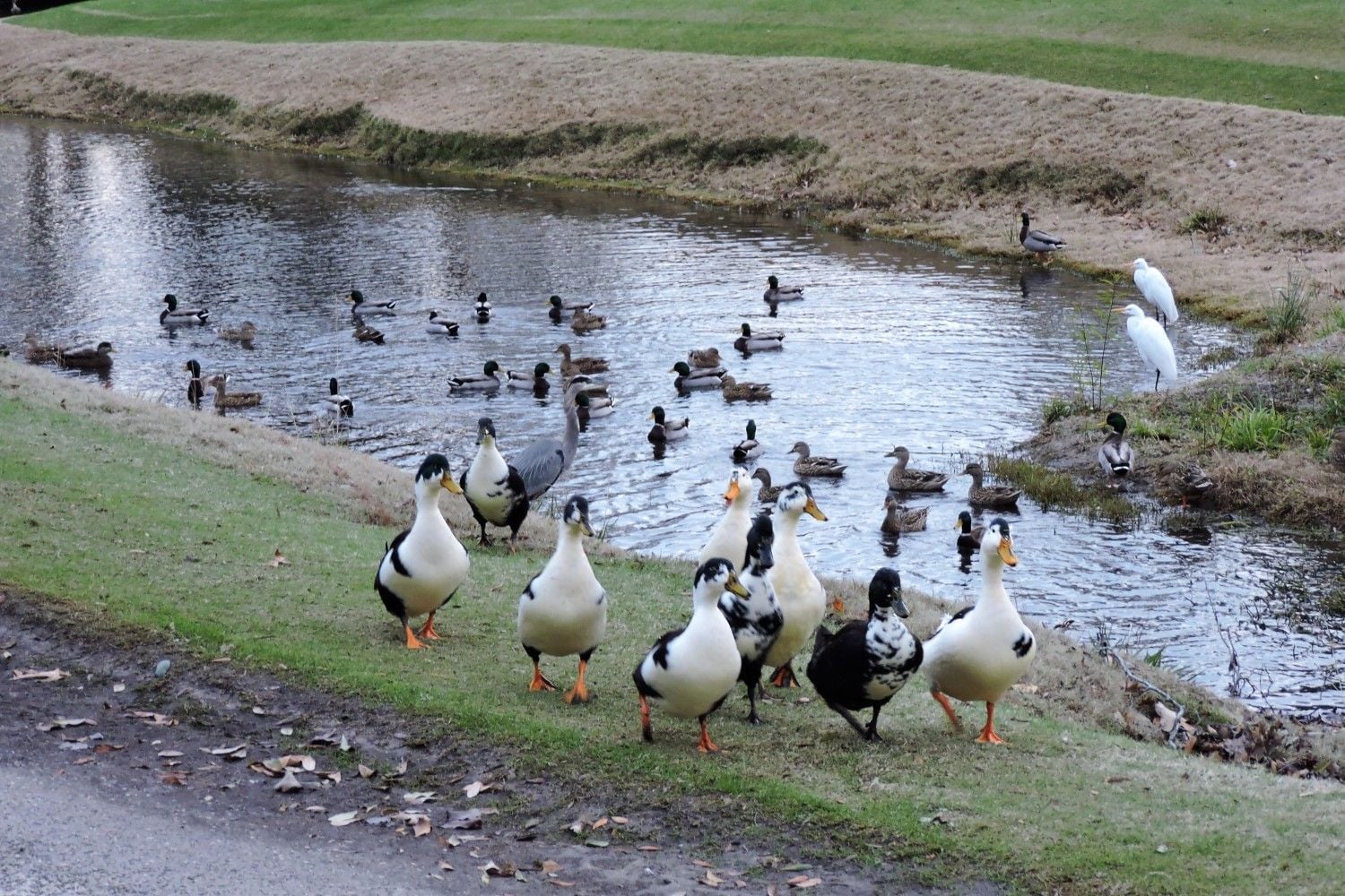 The golf course we live on in SC has taken in 9 Magpies. They were dropped off when the owner was moving and couldn't take them with her. My husband & I were worried since we found out these ducks were raised by a human, but all I know about ducks is what I've read on the internet. We've sort of been looking after them and I have no idea if what we're doing is correct and/or necessary.