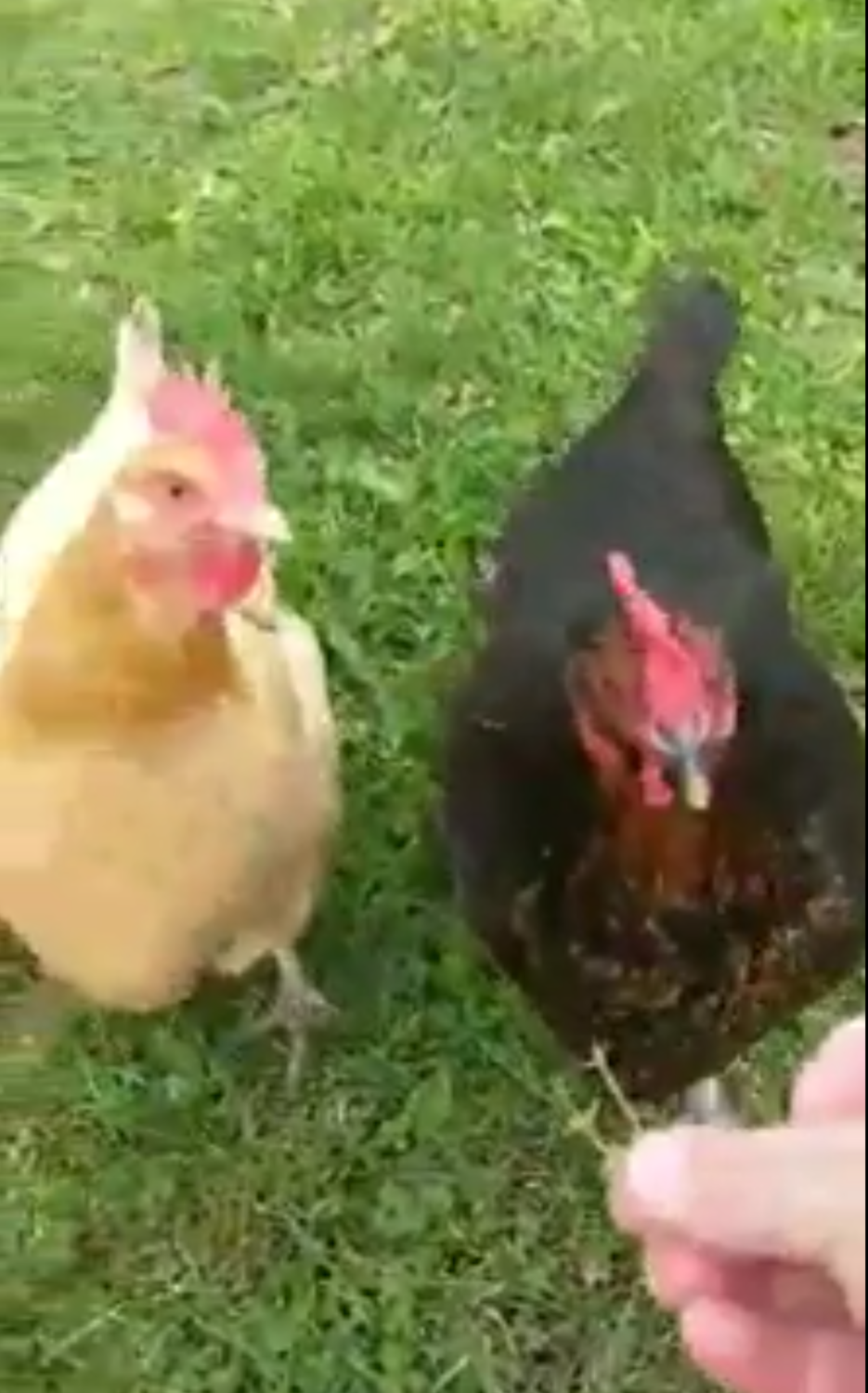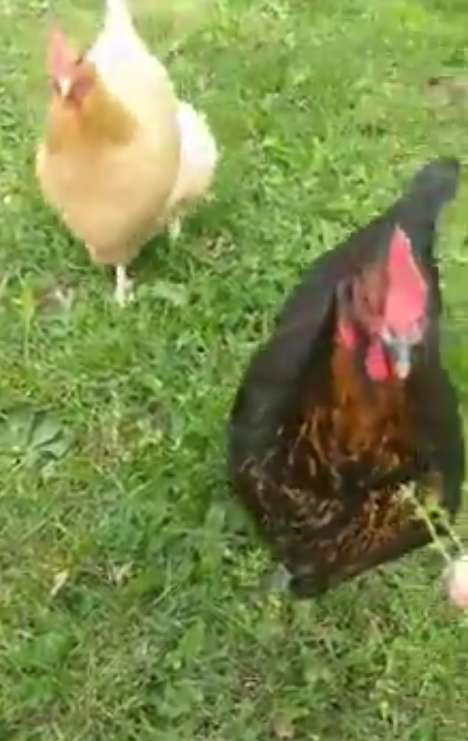 I have a flock of six and not a definite breed determination for at least four of my hens. My original two can be seen in the images below. I apologize for the grainy quality...I had to screenshot from a video. I am fairly certain the hen on the left, let's call her hen A, Anna, is a Buff Orpington. The hen on the right, hen B, Lady Mary, is black with highlights of green on the feathers of her back. The reddish brown color on her breast does not appear elsewhere on her body. I've done a ton of breed searches online and the closest guess, (from the multitude of breeds,) is a Black Sex Link. The neighbor we got them from did not know their breeds either. Both lay a light to medium brown egg.